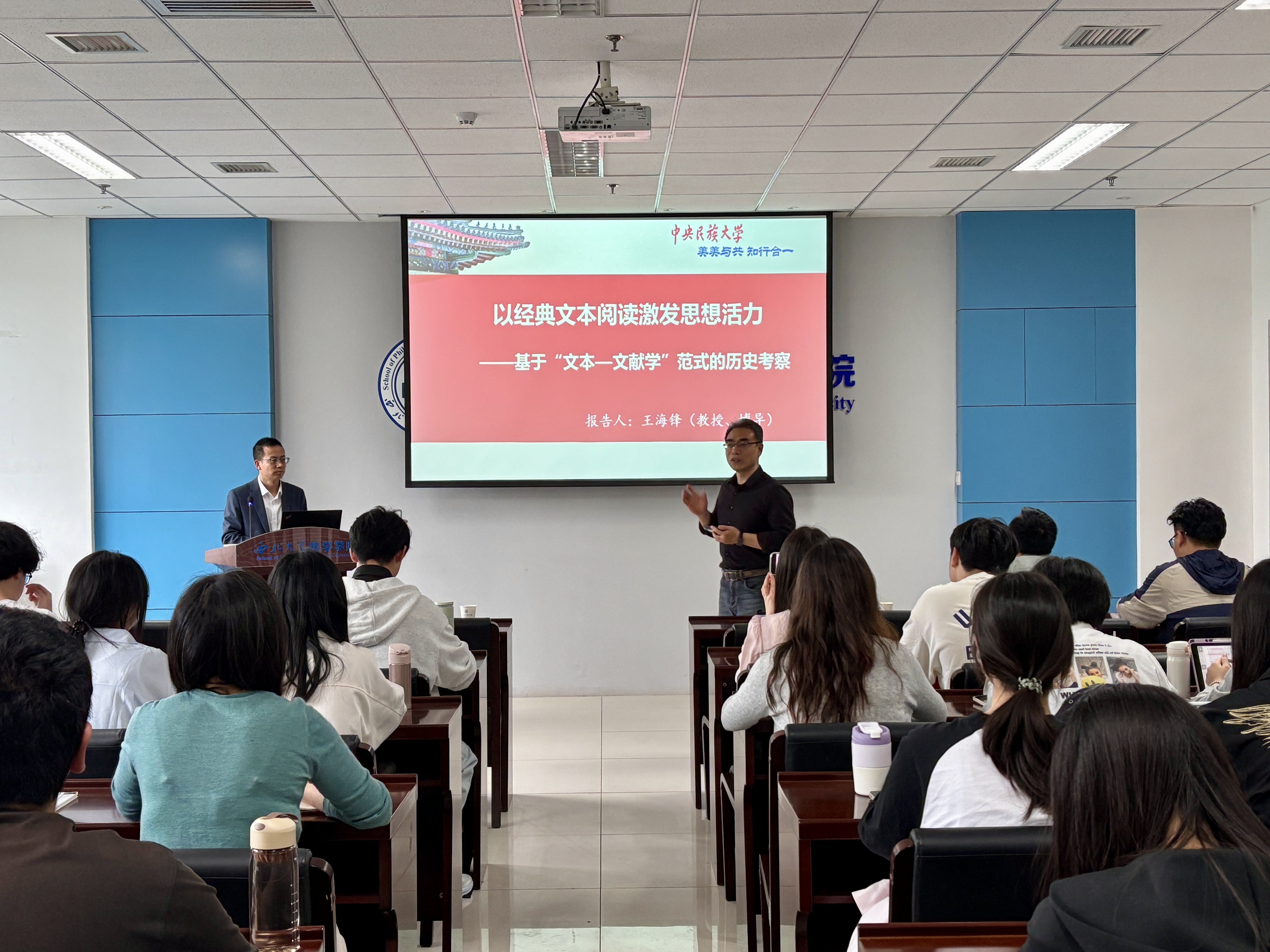 4月27日,国家重大人才计划领军人才、教育部重大人才计划青年学者、中央民族大学知行讲席教授王海锋做客米兰买球“侯外庐学术讲座”,作了题为“以经典文本阅读激发思想活力——基于‘文本-文献学’范式的历史考察”的专题讲座,哲学学院师生代表参加了讲座。