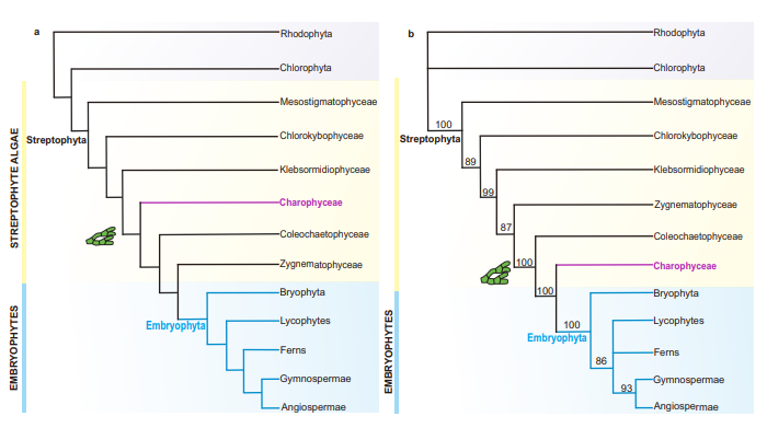 轮藻纲系统发育分析显示与陆地植物具有密切的演化关系:前人基于基因序列(a),本研究基于形态、解剖、生理、关键基因有无等贝叶斯系统发育分析结果(b)
