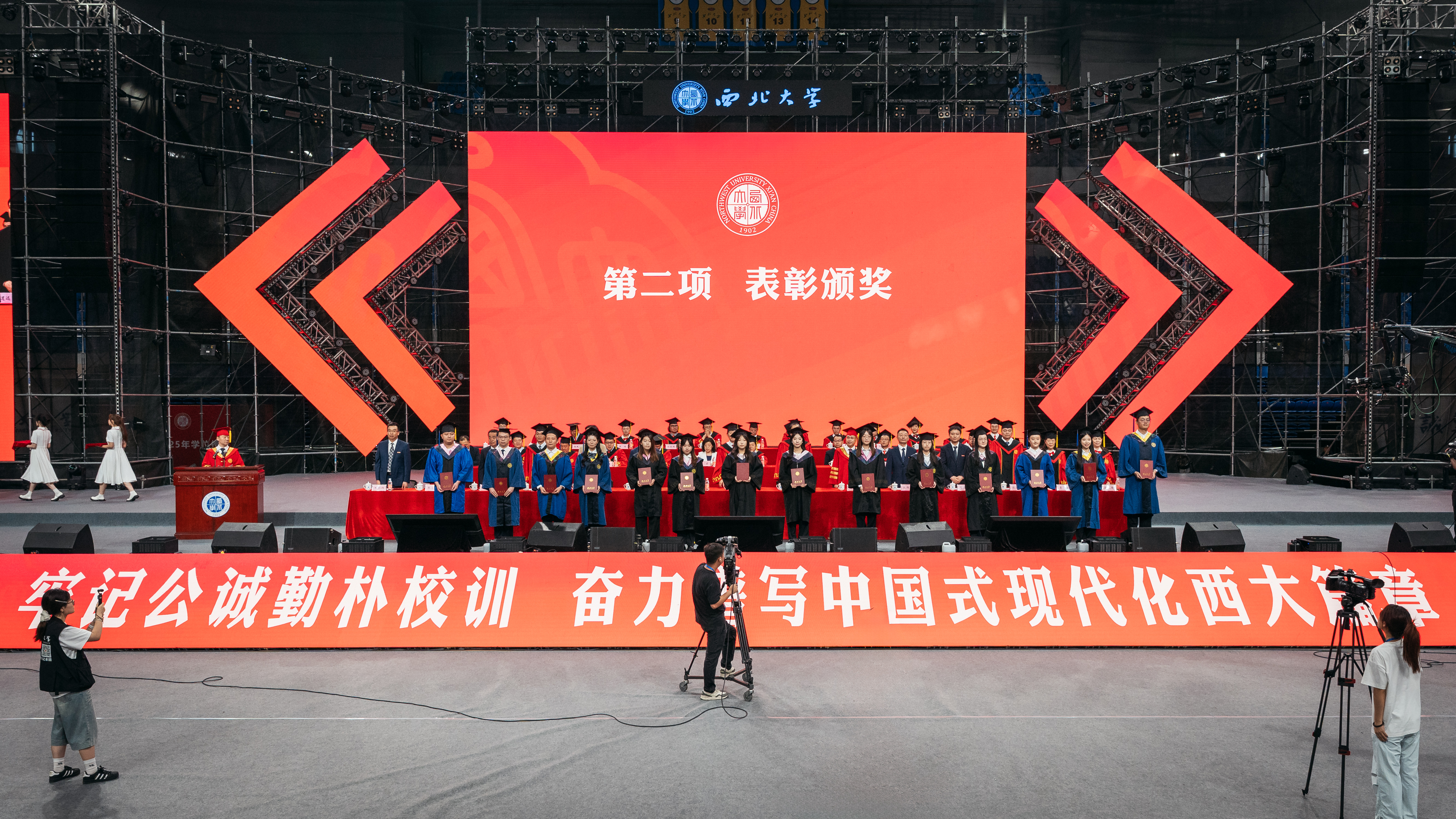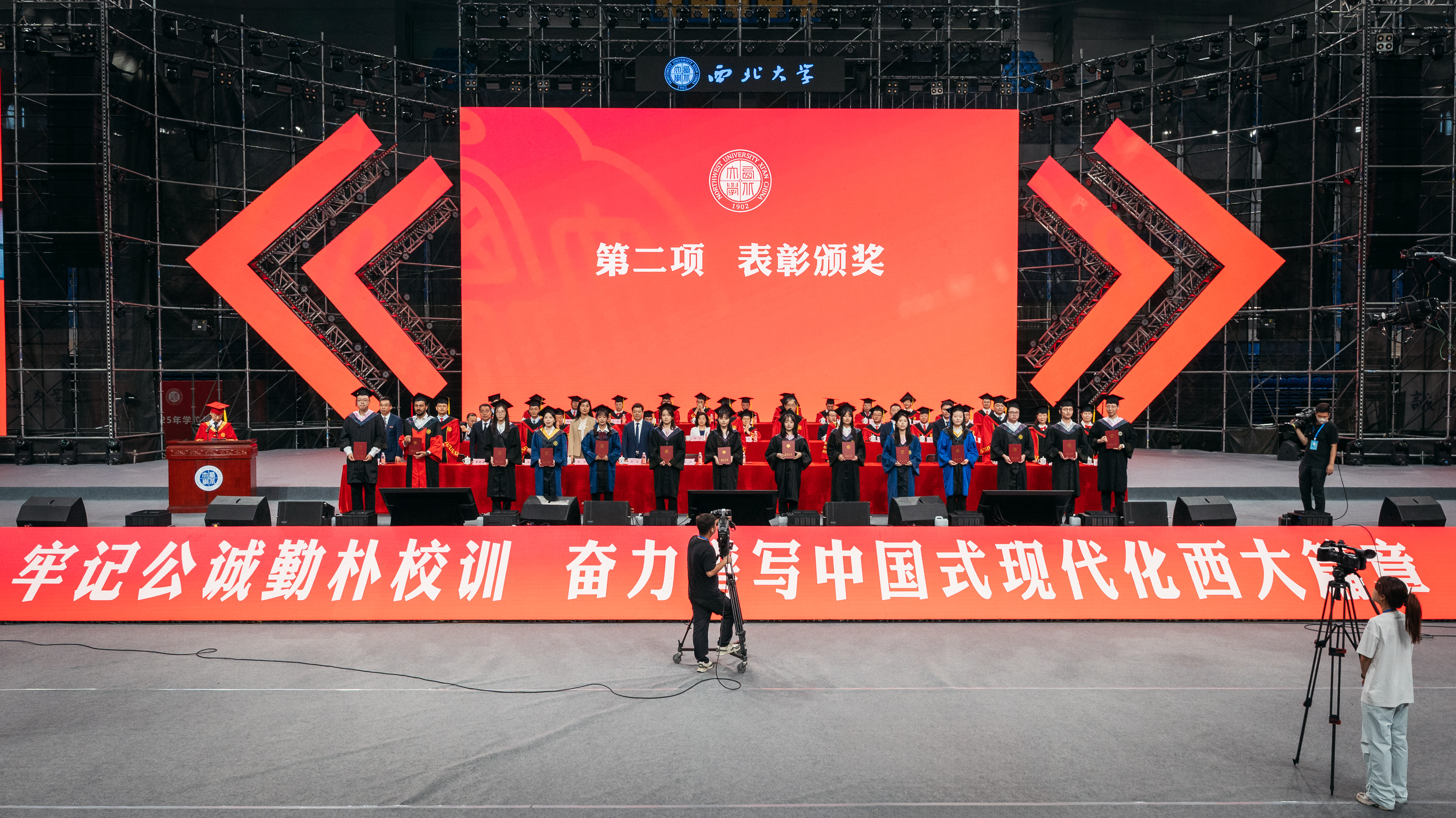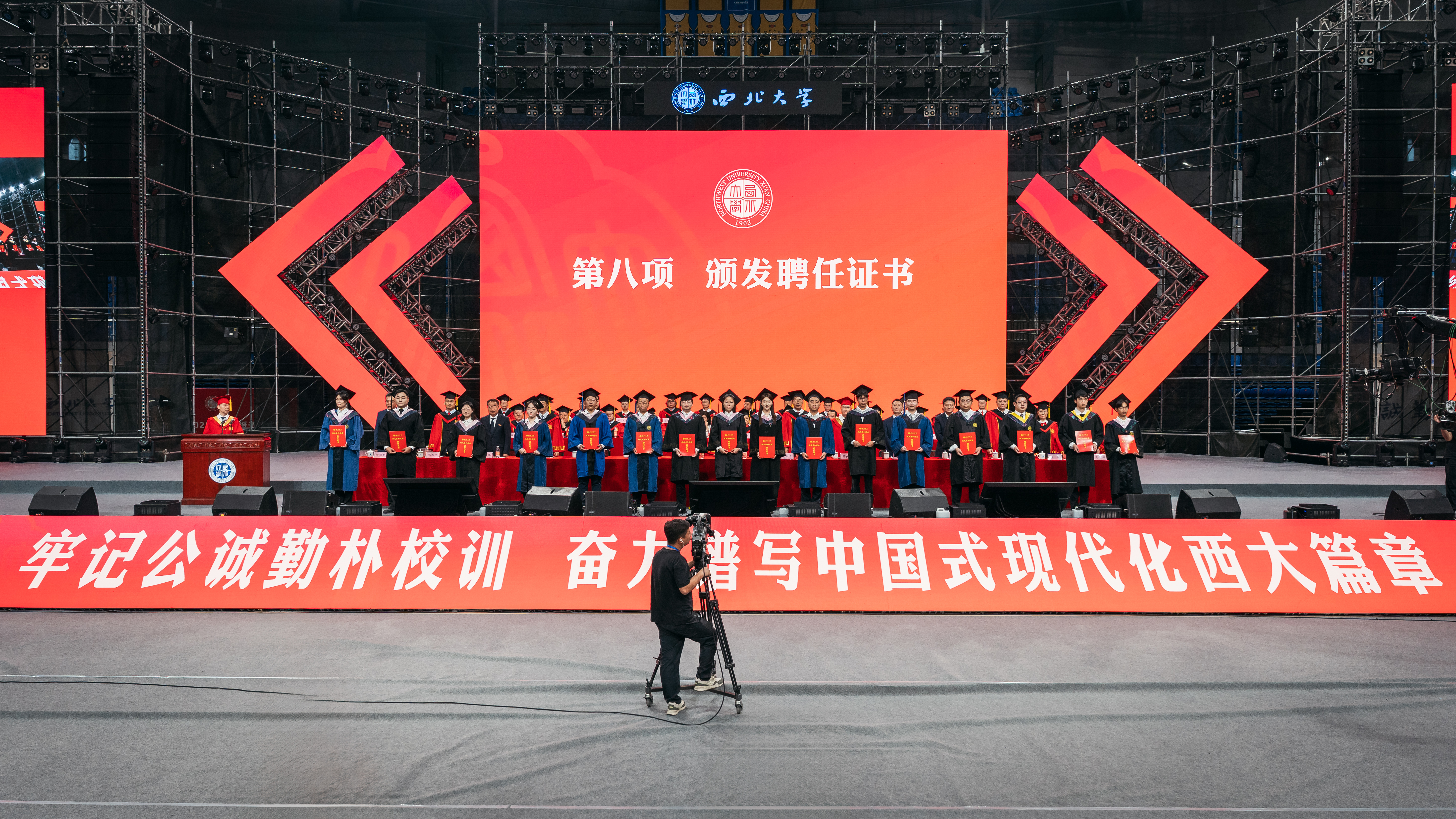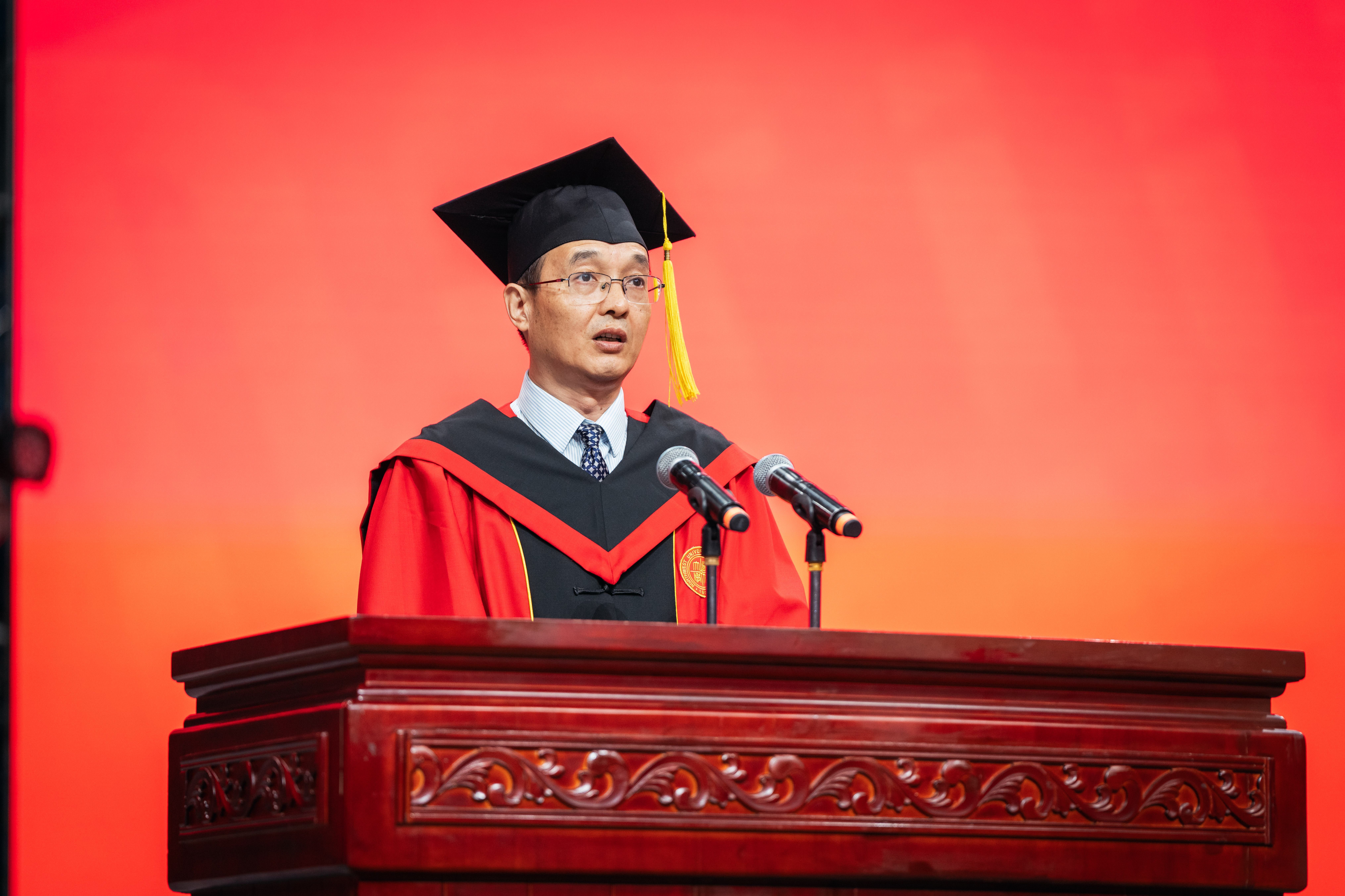孙庆伟校长以“于‘变’中启程,赴精彩人生”为主题,为毕业生送上深情寄语和真挚祝福。他嘱咐同学们,面对即将开启的人生旅程,每个人都要向着心之所向,奔赴属于自己的远方。要以侯外庐先生、张彦仲院士等西大先贤为榜样,把每个“当下”活成生命中的“实心日子”,让小我的微光汇入大时代的星河,带着生长的本能向阳而生,为国家民族作出应有贡献。他期望同学们深刻体悟“明者因时而变,智者随事而制”所蕴藏的深刻哲理,以“穷则变、变则通、通则久”的生命觉醒,主动应变、顺势而为,充分激发内驱力和创造力,致广大而尽精微,奔赴人生精彩。他向毕业生赠与三条“变”的心法。一是从势而变,以目及山河的格局把视野从“笔尖方圆”抬向“时代经纬”。他指出,大学之大就在于学科能为国家主权立据、为文明对话搭桥,在社会发展的痛点、难点中找到学术的支点。希望同学们对人类文明保有更多温情与敬意,坚守“学风当绍横渠之大,文化求复汉唐之隆”的风骨和格局,把人生选择放进“科技强国”“文化传承”的坐标系,充分彰显人生的独特价值。二是从新而变,以拓新破界的勇气让理想从“云端构想”落向“实地深耕”。他强调,真正的创新从来不是“空中楼阁”,而是像地质勘探般“扎根大地”。希望同学们保持持续的自我超越与思维范式更迭,让创新更有厚度、韧性和分量,在实践中为国家发展、文明赓续贡献力量。三是从心而变,以心纳江海的定力让胸怀从“容纳自我”通向“兼济万物”。他指出,“小”从来不是局限,而是“大生命”的起点,“无力感”从来不是终点,而是“生长力”的序章。希望同学们突破“想太多、做太少”的自我拉扯,保持内心定力,在不断积累中实现厚积薄发。他深情送别毕业生:毕业不是告别,而是人生的“再出发”。祝愿同学们在母校每一个“小”的瞬间,都成为书写人生新页的注脚;每一次“变”的觉醒,都化作奔赴精彩人生的星火。