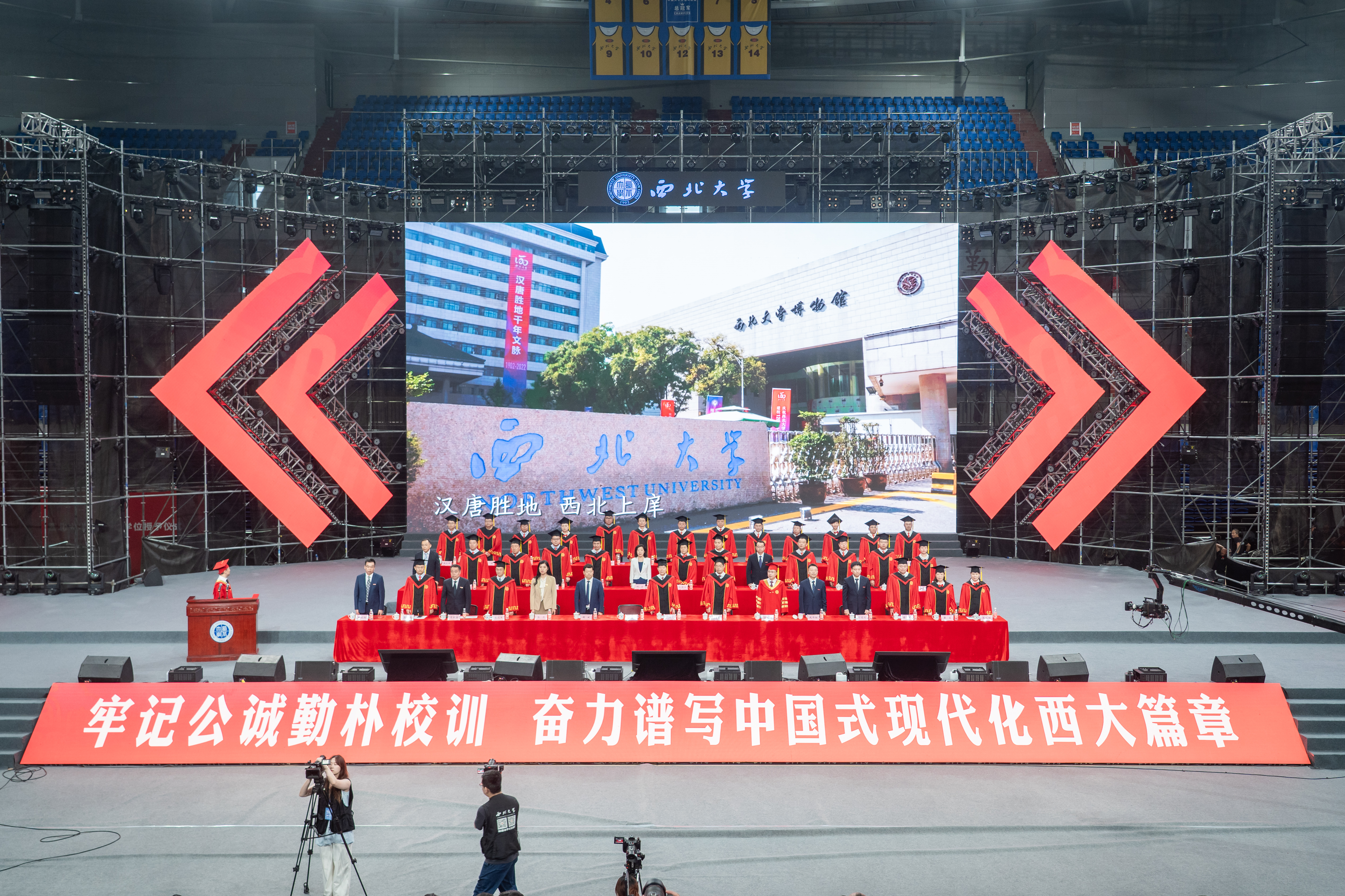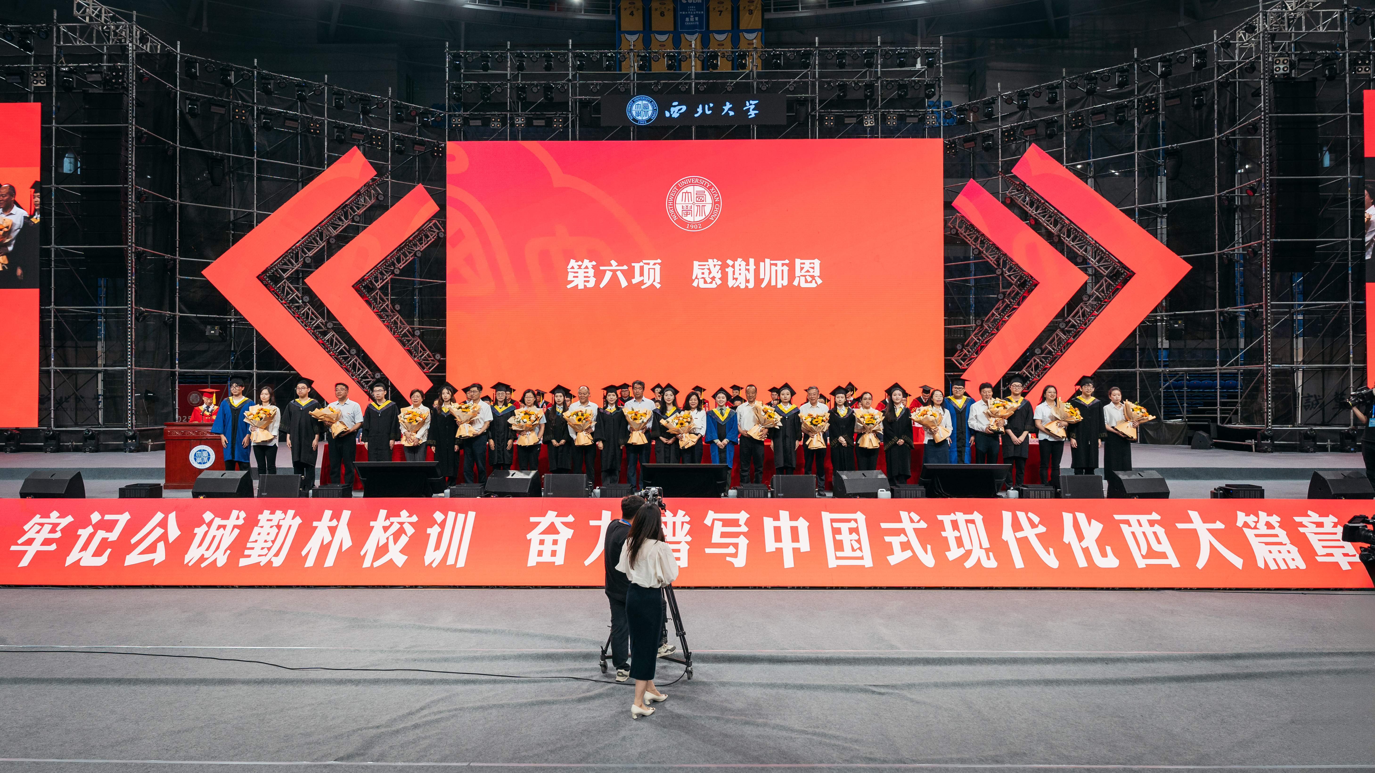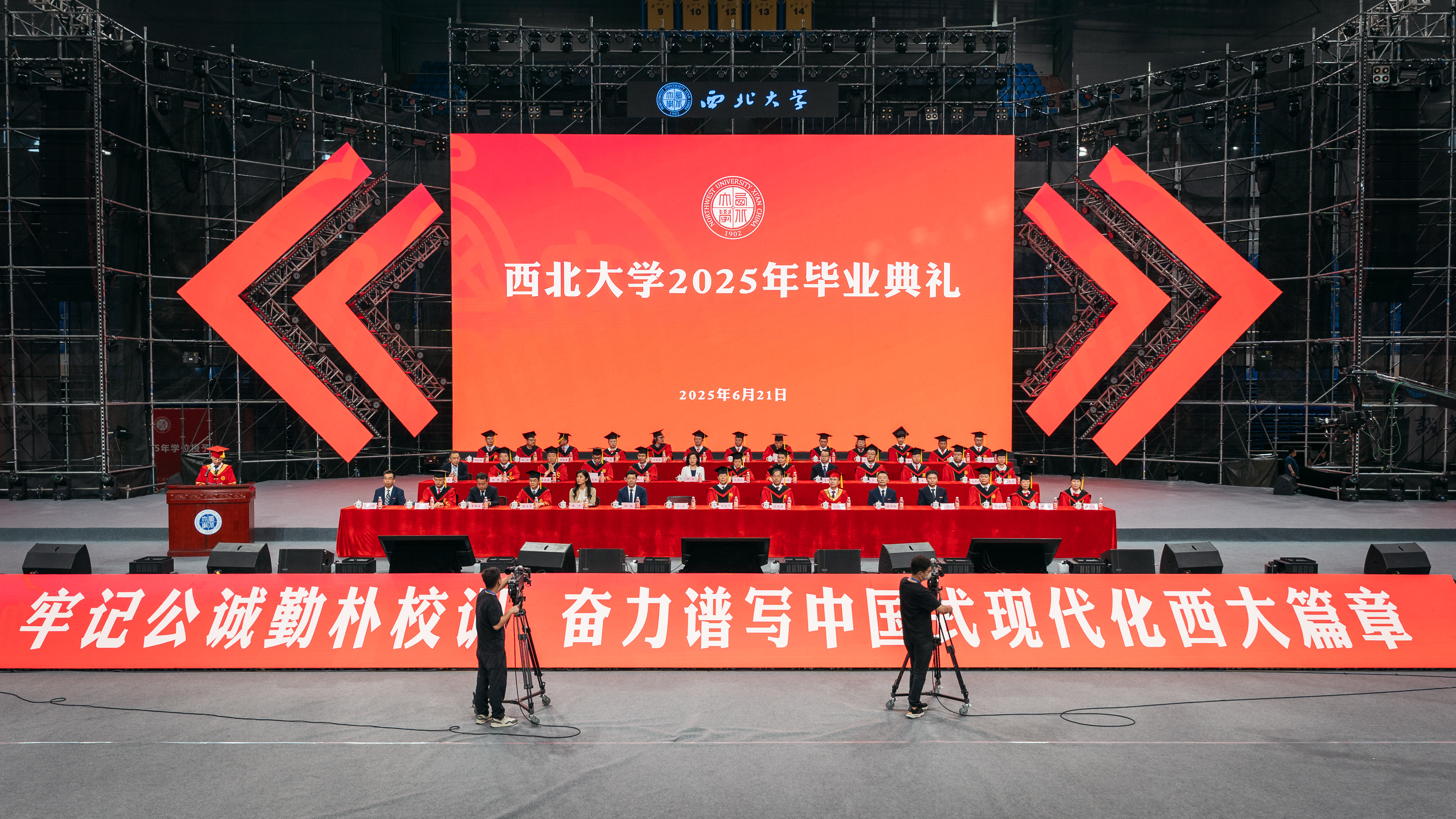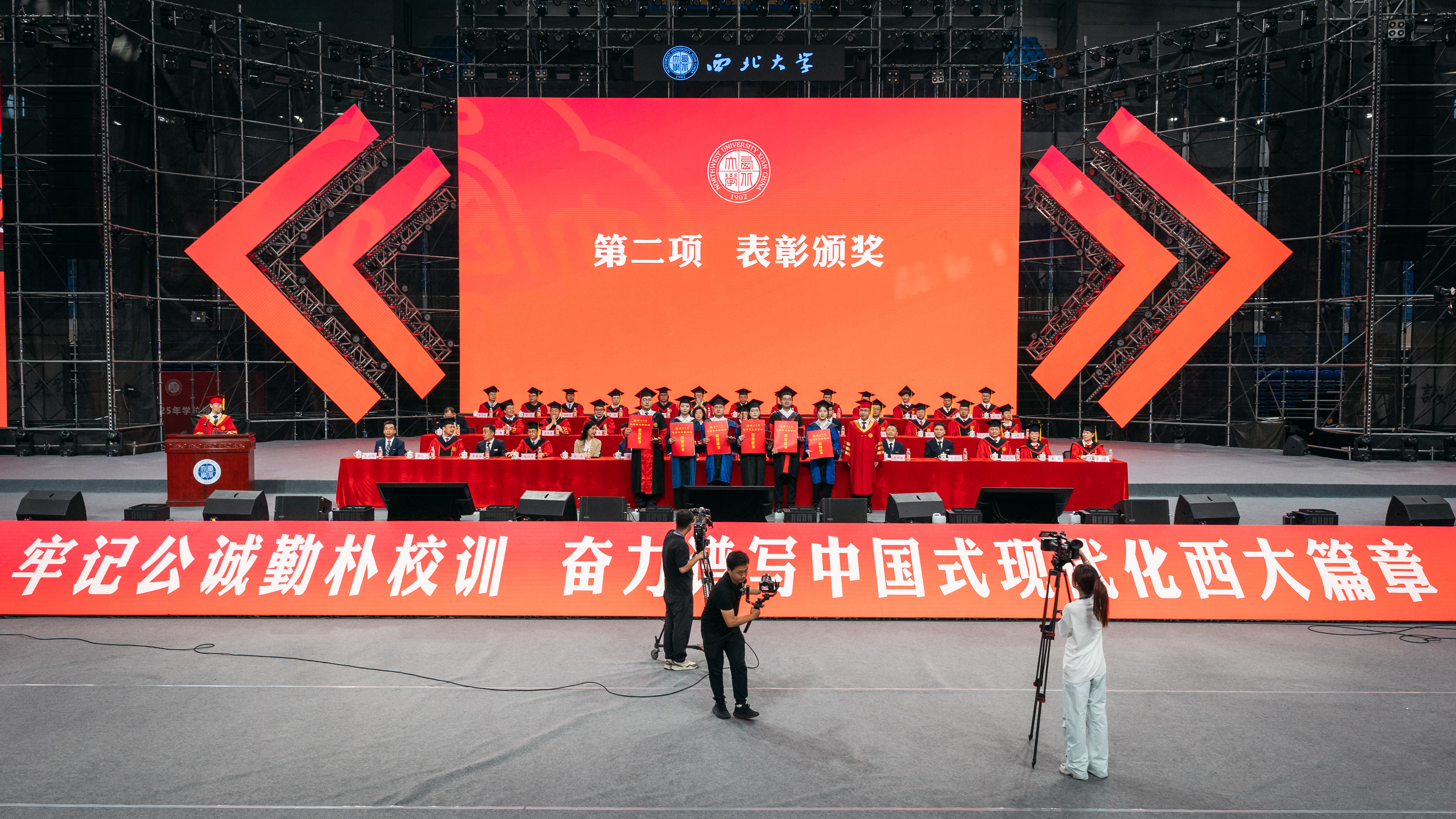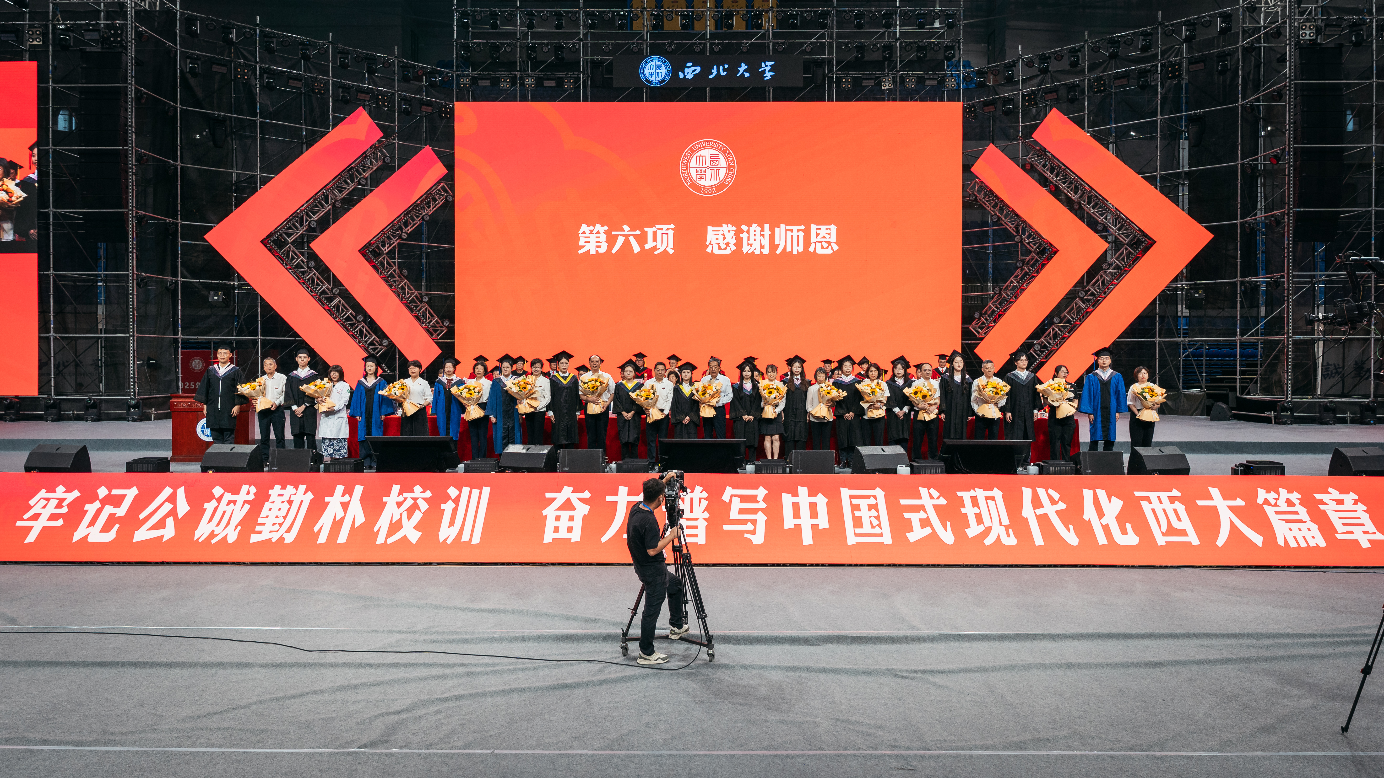 孙庆伟校长以“于‘变’中启程,赴精彩人生”为主题,为毕业生送上深情寄语和真挚祝福。他嘱咐同学们,面对即将开启的人生旅程,每个人都要向着心之所向,奔赴属于自己的远方。要以侯外庐先生、张彦仲院士等西大先贤为榜样,把每个“当下”活成生命中的“实心日子”,让小我的微光汇入大时代的星河,带着生长的本能向阳而生,为国家民族作出应有贡献。他期望同学们深刻体悟“明者因时而变,智者随事而制”所蕴藏的深刻哲理,以“穷则变、变则通、通则久”的生命觉醒,主动应变、顺势而为,充分激发内驱力和创造力,致广大而尽精微,奔赴人生精彩。他向毕业生赠与三条“变”的心法。一是从势而变,以目及山河的格局把视野从“笔尖方圆”抬向“时代经纬”。他指出,大学之大就在于学科能为国家主权立据、为文明对话搭桥,在社会发展的痛点、难点中找到学术的支点。希望同学们对人类文明保有更多温情与敬意,坚守“学风当绍横渠之大,文化求复汉唐之隆”的风骨和格局,把人生选择放进“科技强国”“文化传承”的坐标系,充分彰显人生的独特价值。二是从新而变,以拓新破界的勇气让理想从“云端构想”落向“实地深耕”。他强调,真正的创新从来不是“空中楼阁”,而是像地质勘探般“扎根大地”。希望同学们保持持续的自我超越与思维范式更迭,让创新更有厚度、韧性和分量,在实践中为国家发展、文明赓续贡献力量。三是从心而变,以心纳江海的定力让胸怀从“容纳自我”通向“兼济万物”。他指出,“小”从来不是局限,而是“大生命”的起点,“无力感”从来不是终点,而是“生长力”的序章。希望同学们突破“想太多、做太少”的自我拉扯,保持内心定力,在不断积累中实现厚积薄发。他深情送别毕业生:毕业不是告别,而是人生的“再出发”。祝愿同学们在母校每一个“小”的瞬间,都成为书写人生新页的注脚;每一次“变”的觉醒,都化作奔赴精彩人生的星火。