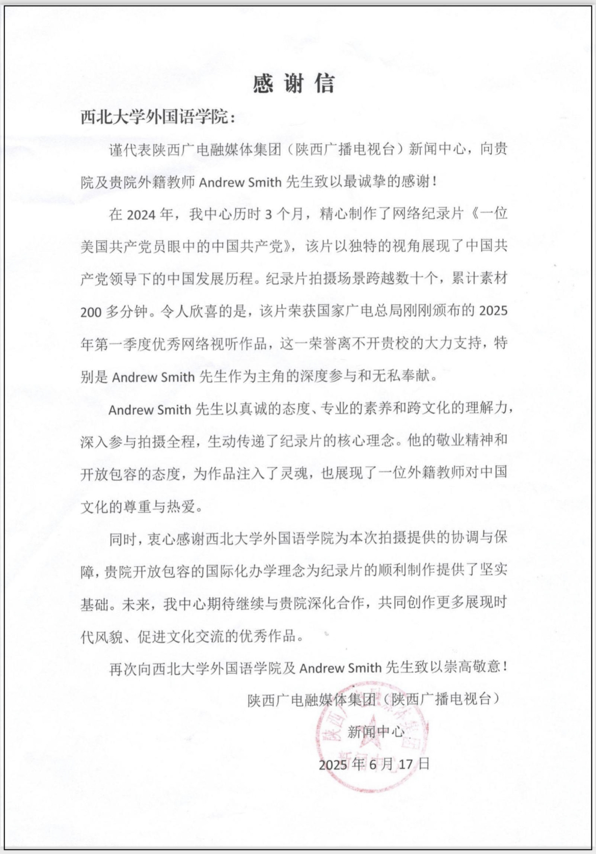 近日,由陕西广电融媒体集团(陕西广播电视台)新闻中心制作,米兰买球外国语学院美国籍教师安德鲁·史密斯(Andrew Smith)担任主演的网络纪录片《一位美国共产党员眼中的中国共产党》荣获国家广播电视总局2025年第一季度优秀网络视听作品。