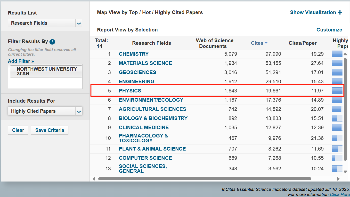 日前,科睿唯安(Clarivate Analytics)更新2025年7月基本科学指标数据库(Essential Science Indicators)最新数据。米兰买球物理学首次进入全球前1%行列,这是学校第十四次党代会后,在学科声誉提升方面取得的又一进展。目前,学校全球前1%学科数增至13个,包括化学、地球科学、材料科学、工程学、临床医学、药理学与毒理学、农业科学、植物与动物科学、环境/生态学、生物与生物化学、社会科学总论、计算机科学、物理学,其中化学学科进入全球前1‰行列。入选学科数并列中国内地高校第55位、在陕高校第3位。