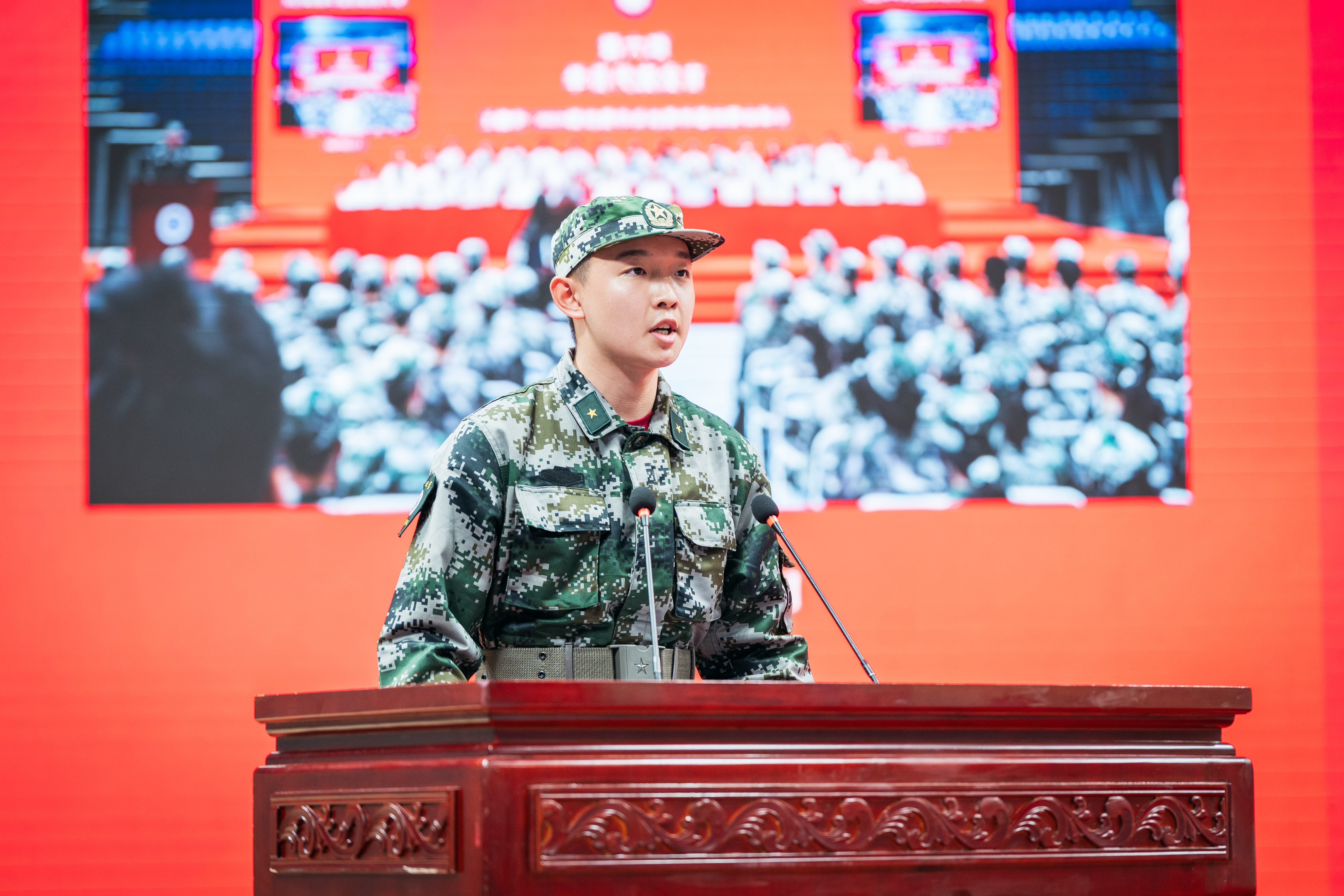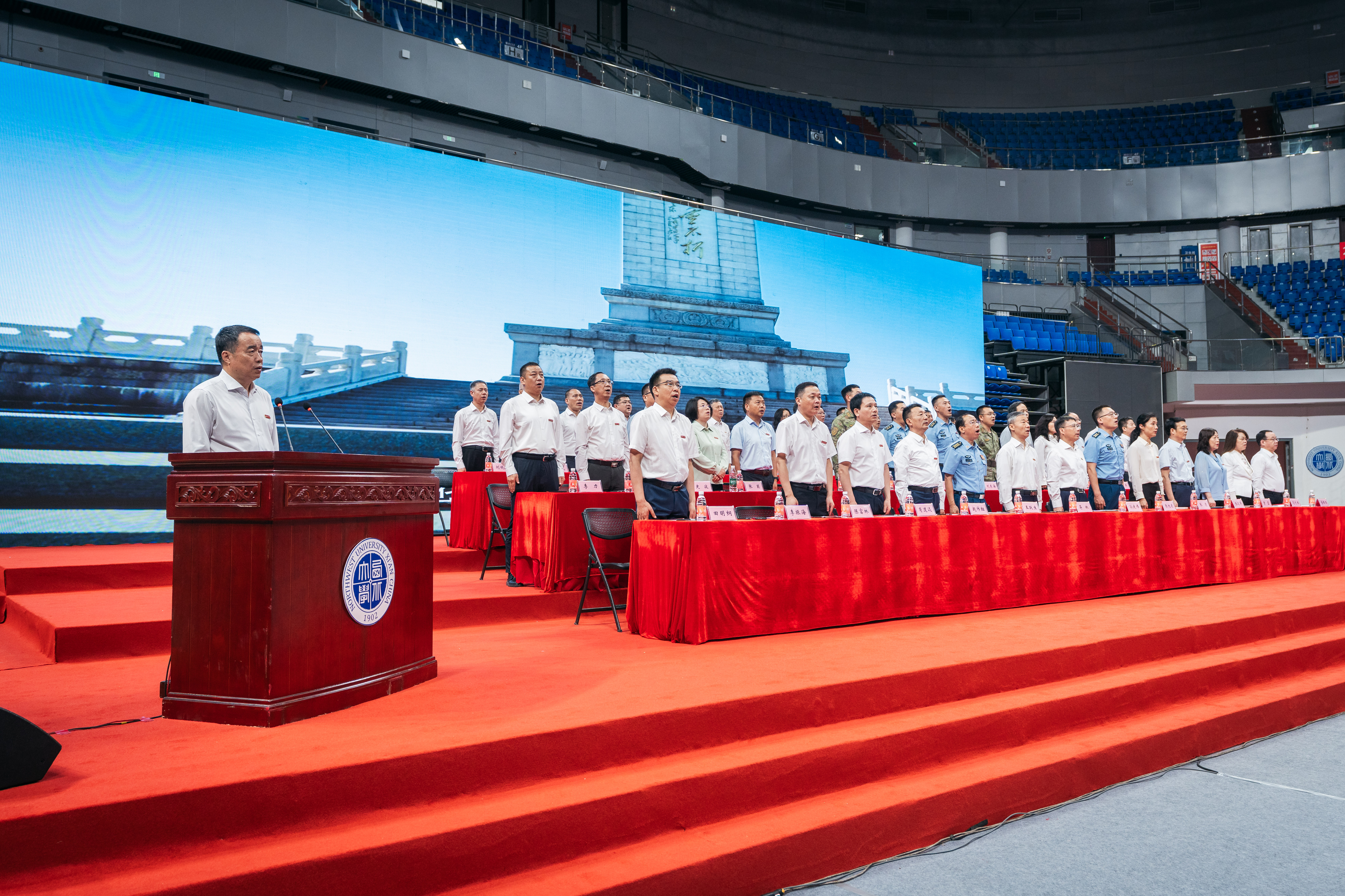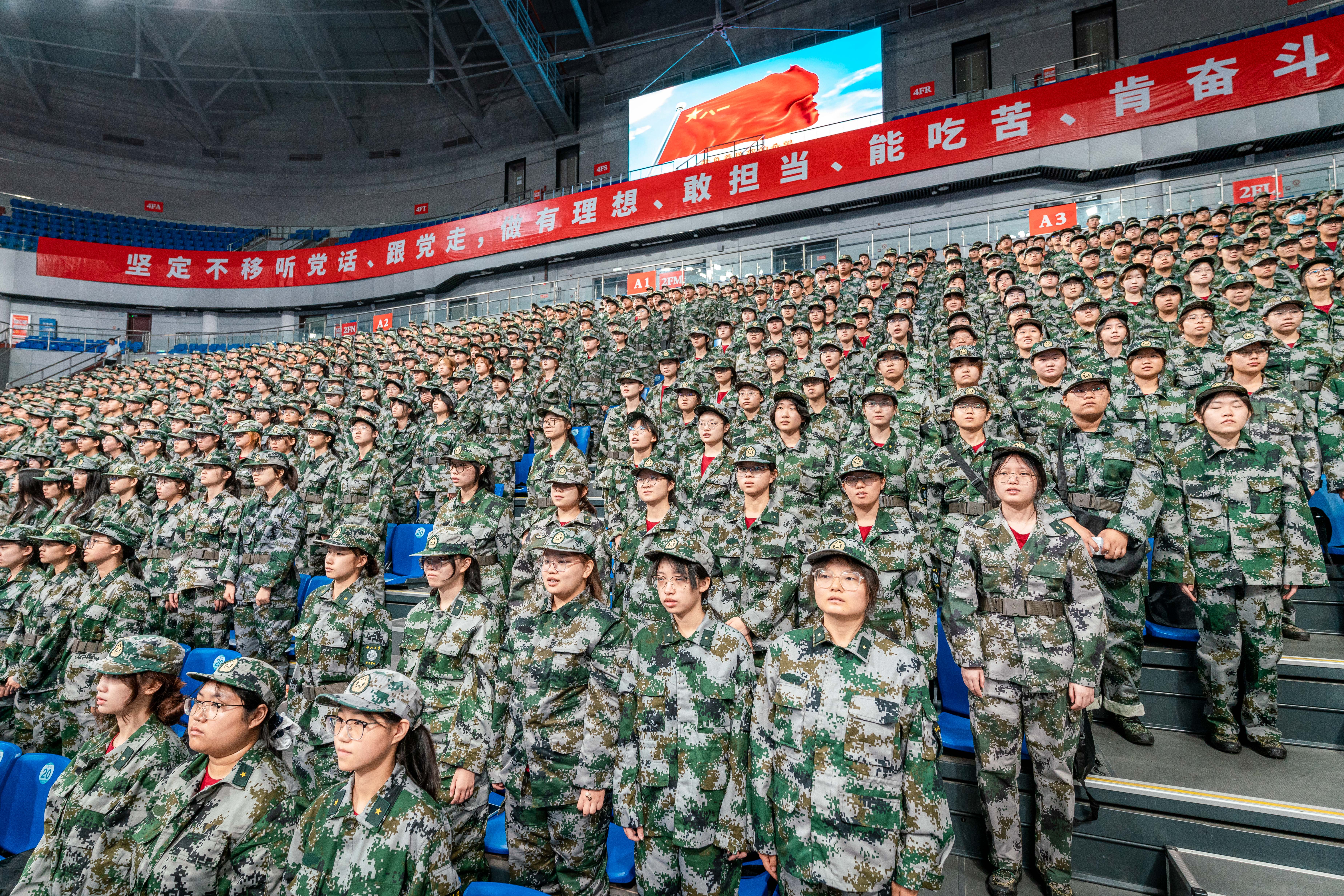 动员大会在《义勇军进行曲》的庄严旋律中拉开序幕,参会的师生和教官全体肃立、齐唱国歌。