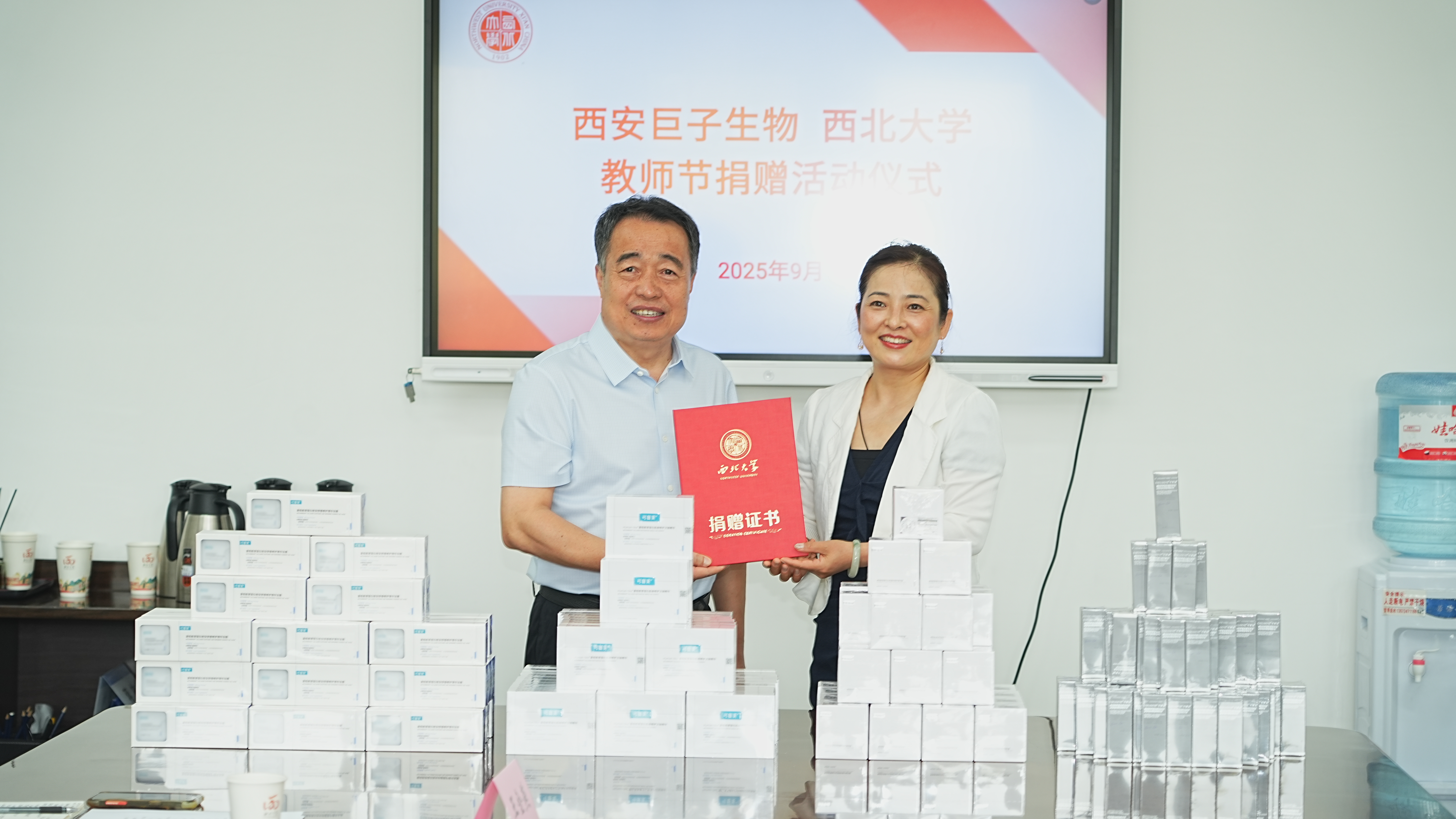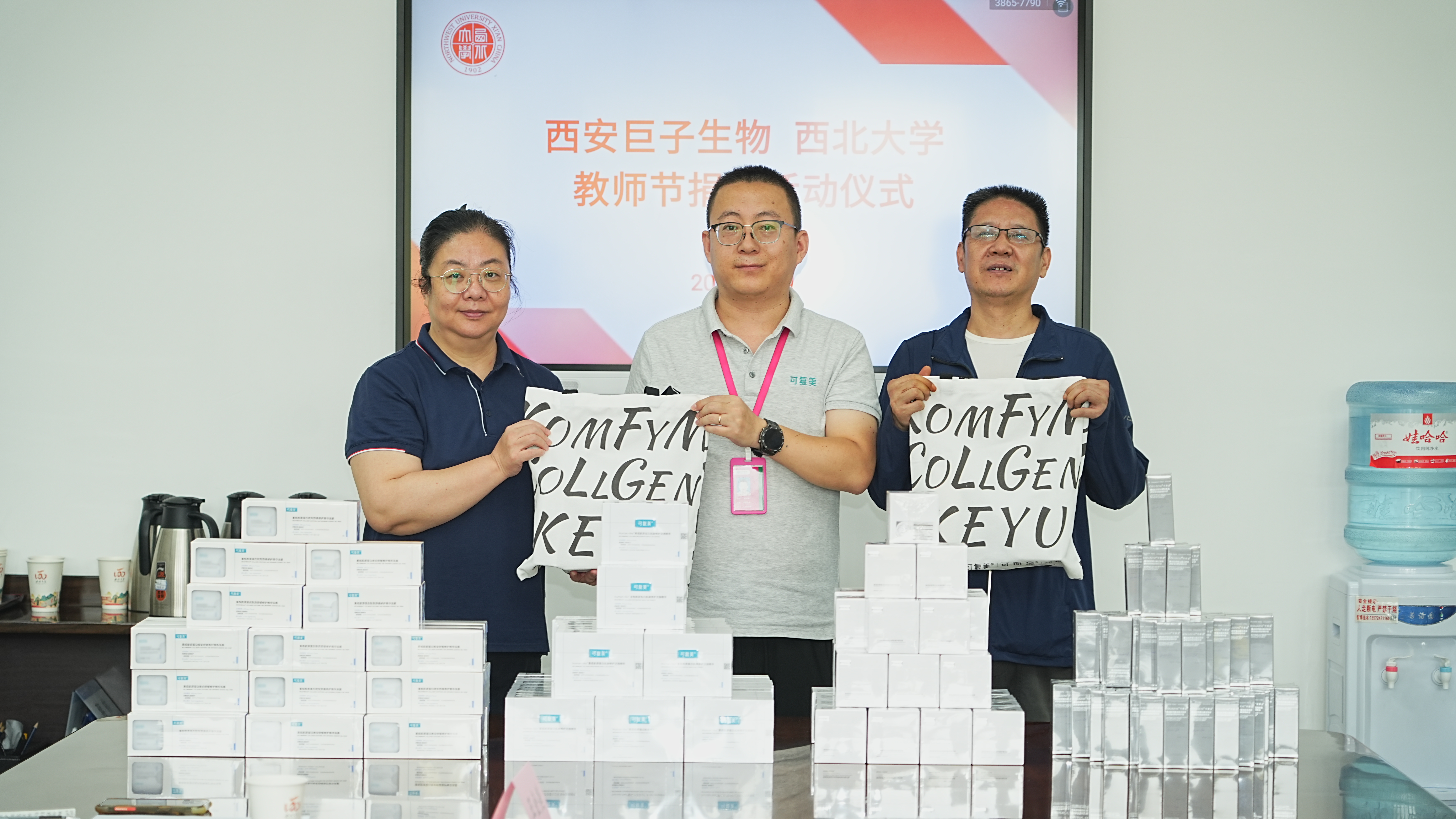 9月9日上午,在第41个教师节来临之际,米兰买球校友企业向学校捐赠可复美、可丽金系列产品,为学校全体教育工作者送来节日祝福与问候。校党委常委、副校长李振海,西安巨子生物基因技术股份有限公司首席财务官张慧娟,西安高新巨子医疗美容诊所院长王艳,西安巨子生物基因技术股份有限公司人事行政主管霍宝玉,国内处、校工会、离退休处负责人参加仪式。