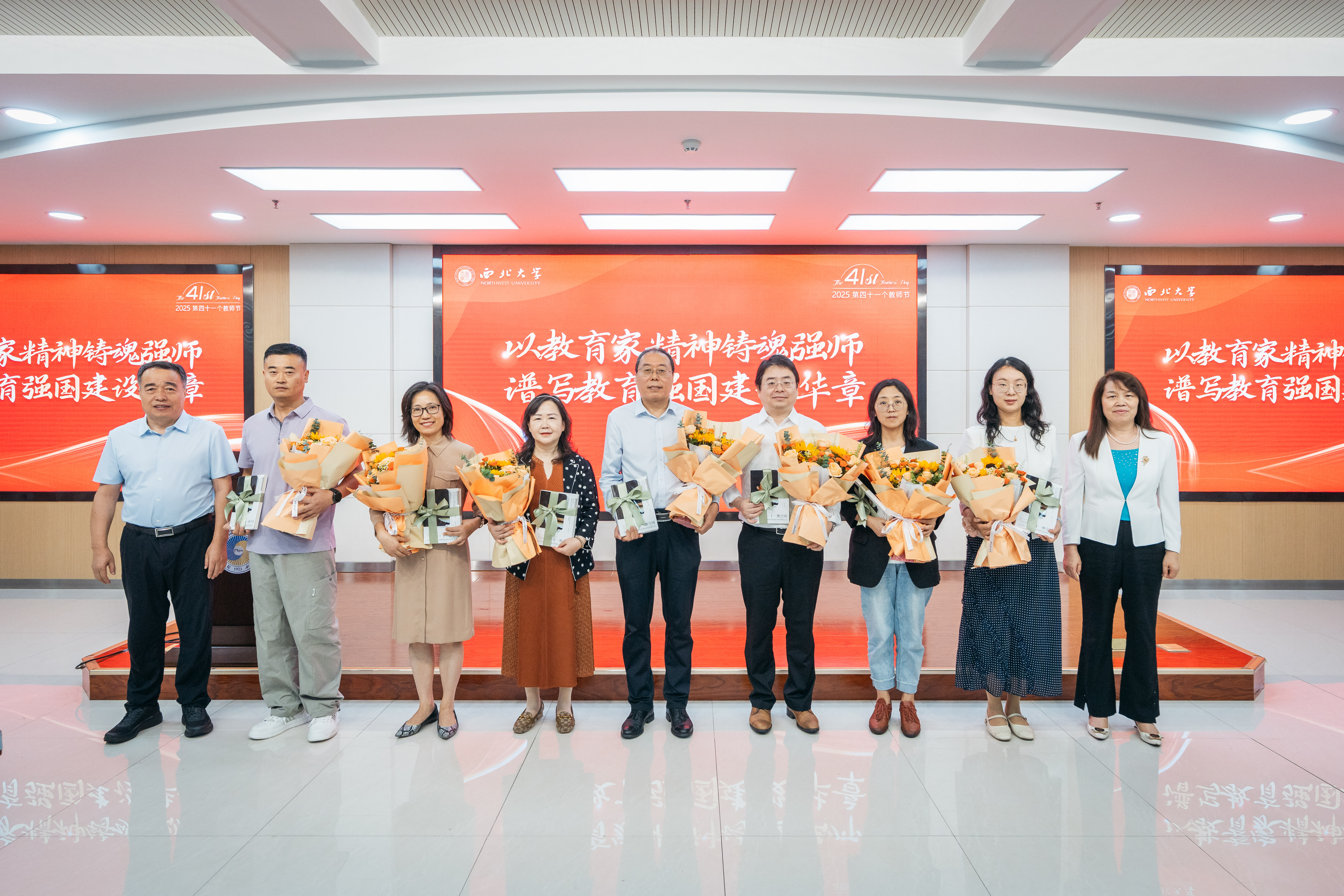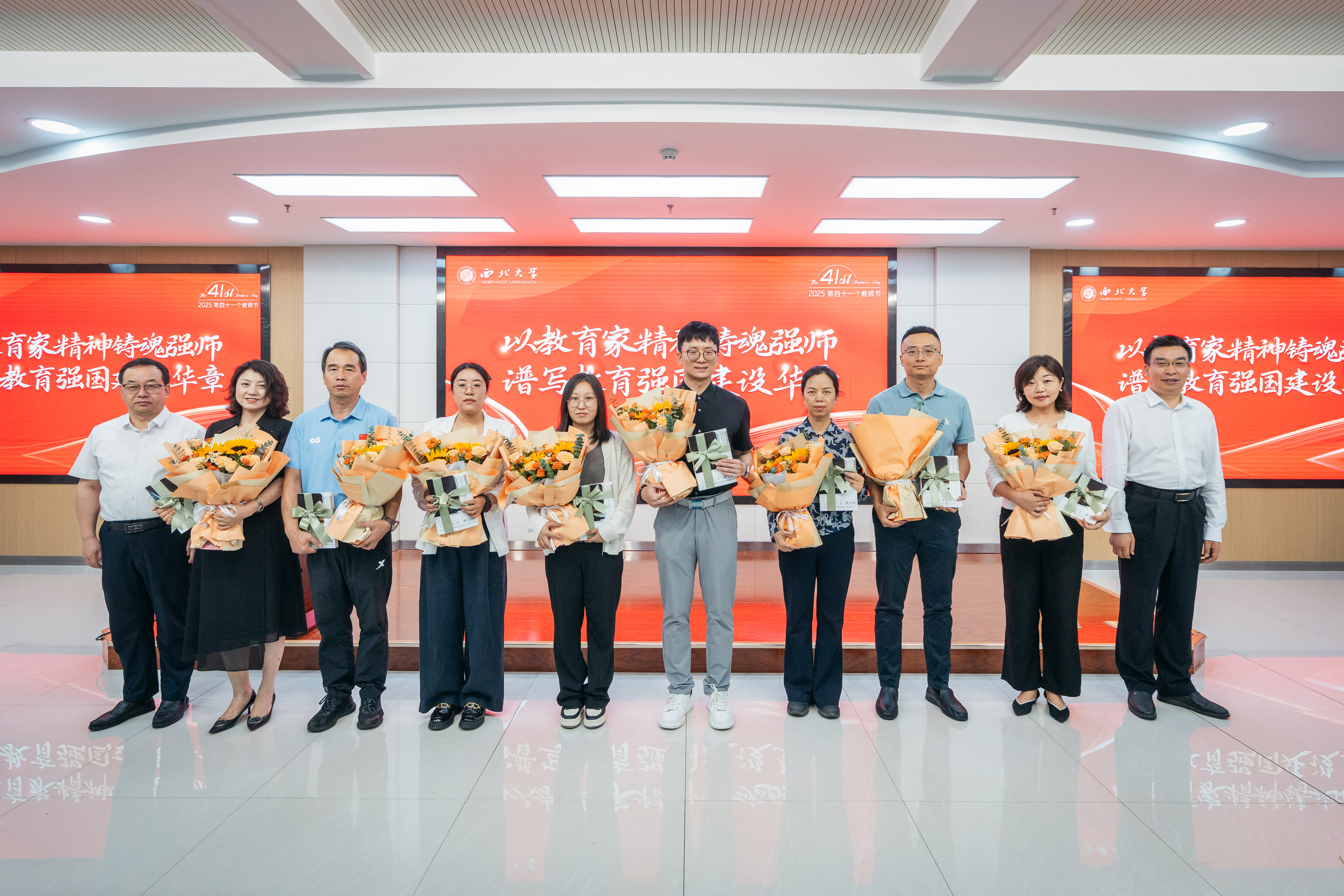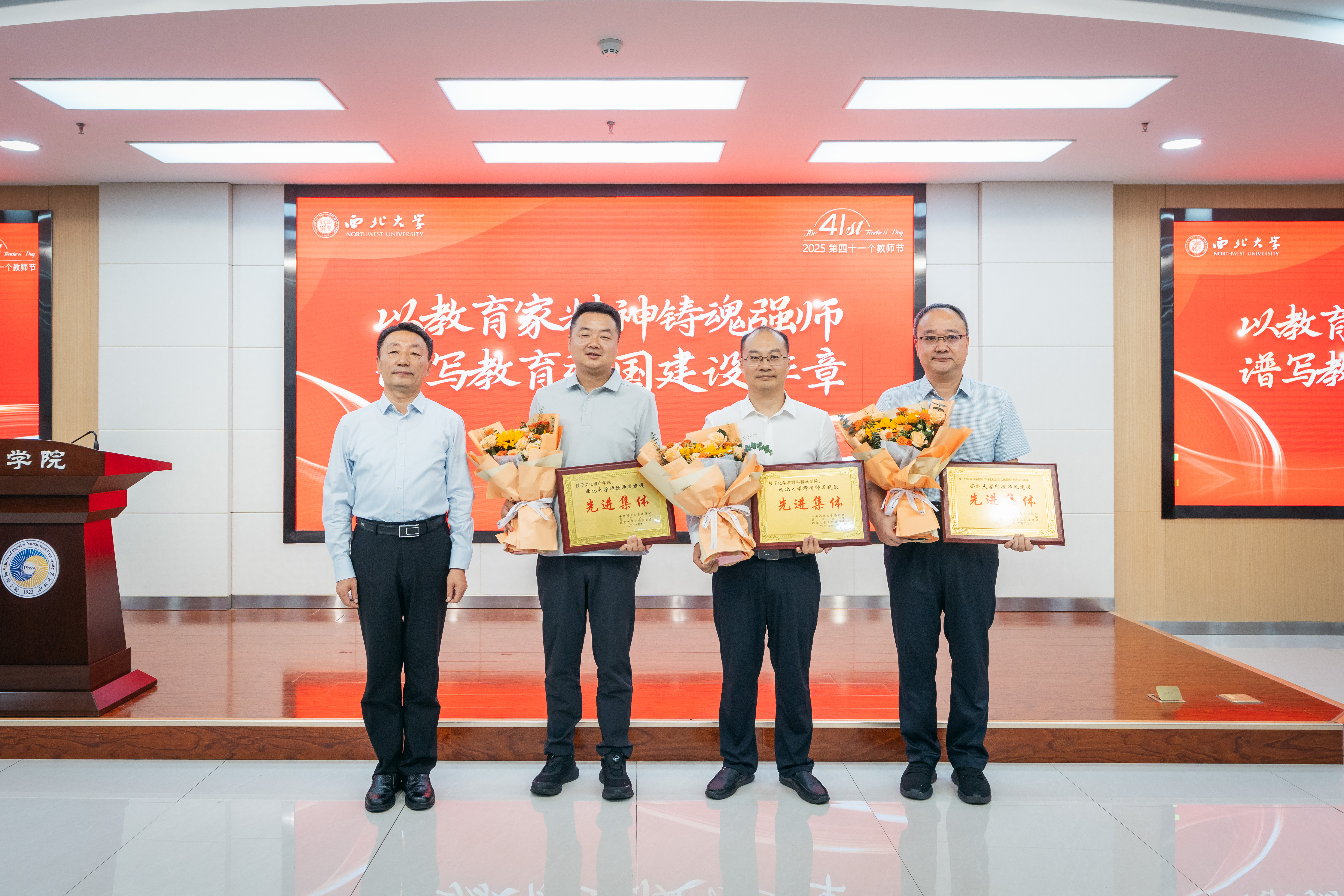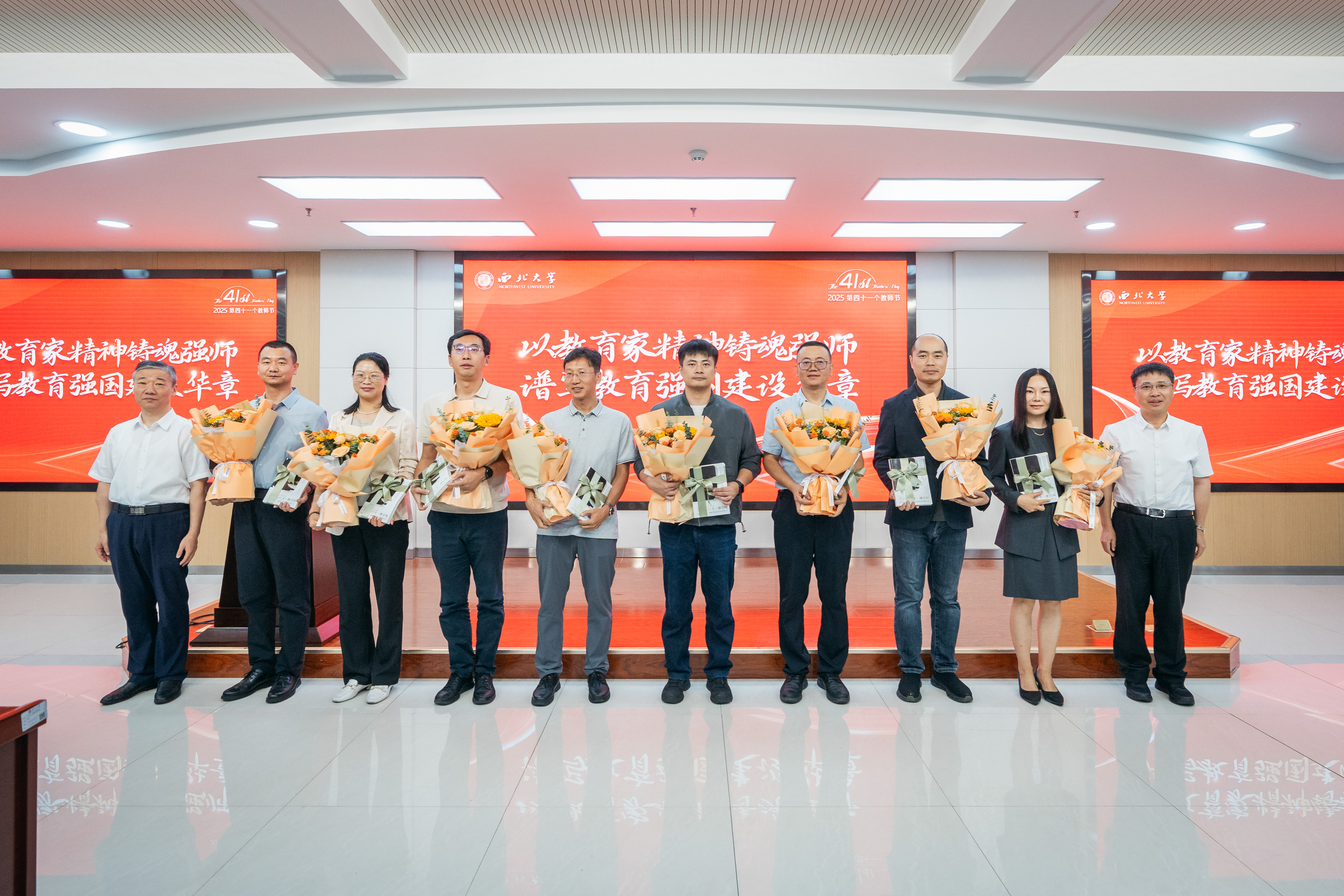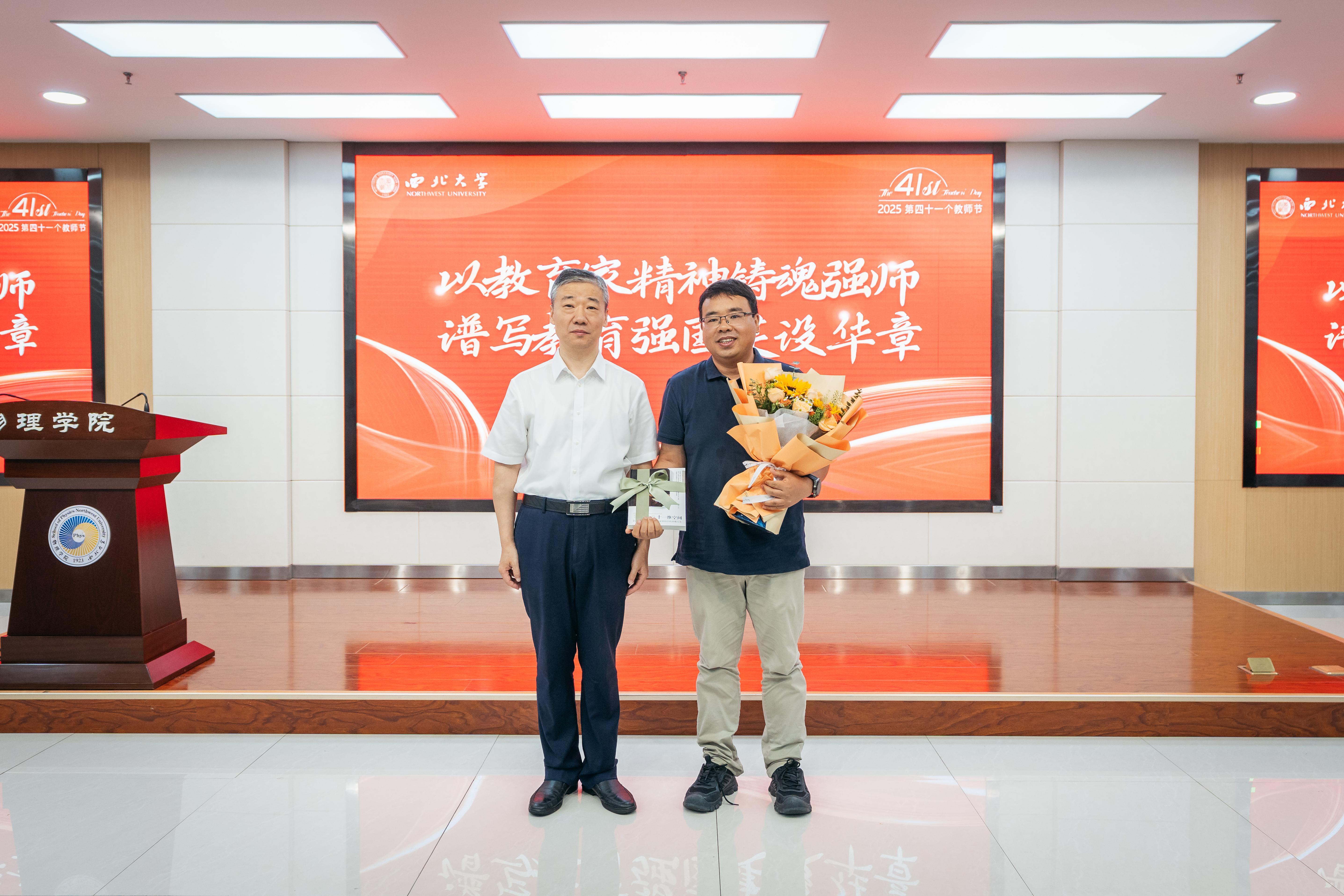 与会校领导为获奖教职工代表赠送侯伯宇教授传记——《十一维空间:物理学家侯伯宇的多维人生》。学生代表向获奖教师献花并致以节日祝福。
