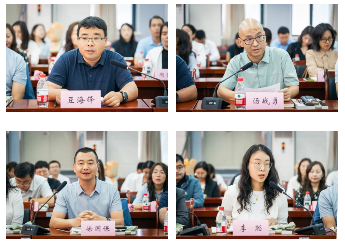 第四批“全国高校黄大年式教师团队”成员、文化遗产学院教授豆海锋,师德师风先进个人代表、计算机学院教授汤战勇,优秀教师代表、城环学院教授徐国保,先进工作者代表、化材学院正高级工程师李聪分别结合教育教学和工作实际进行了发言交流,畅谈了体会感悟。
