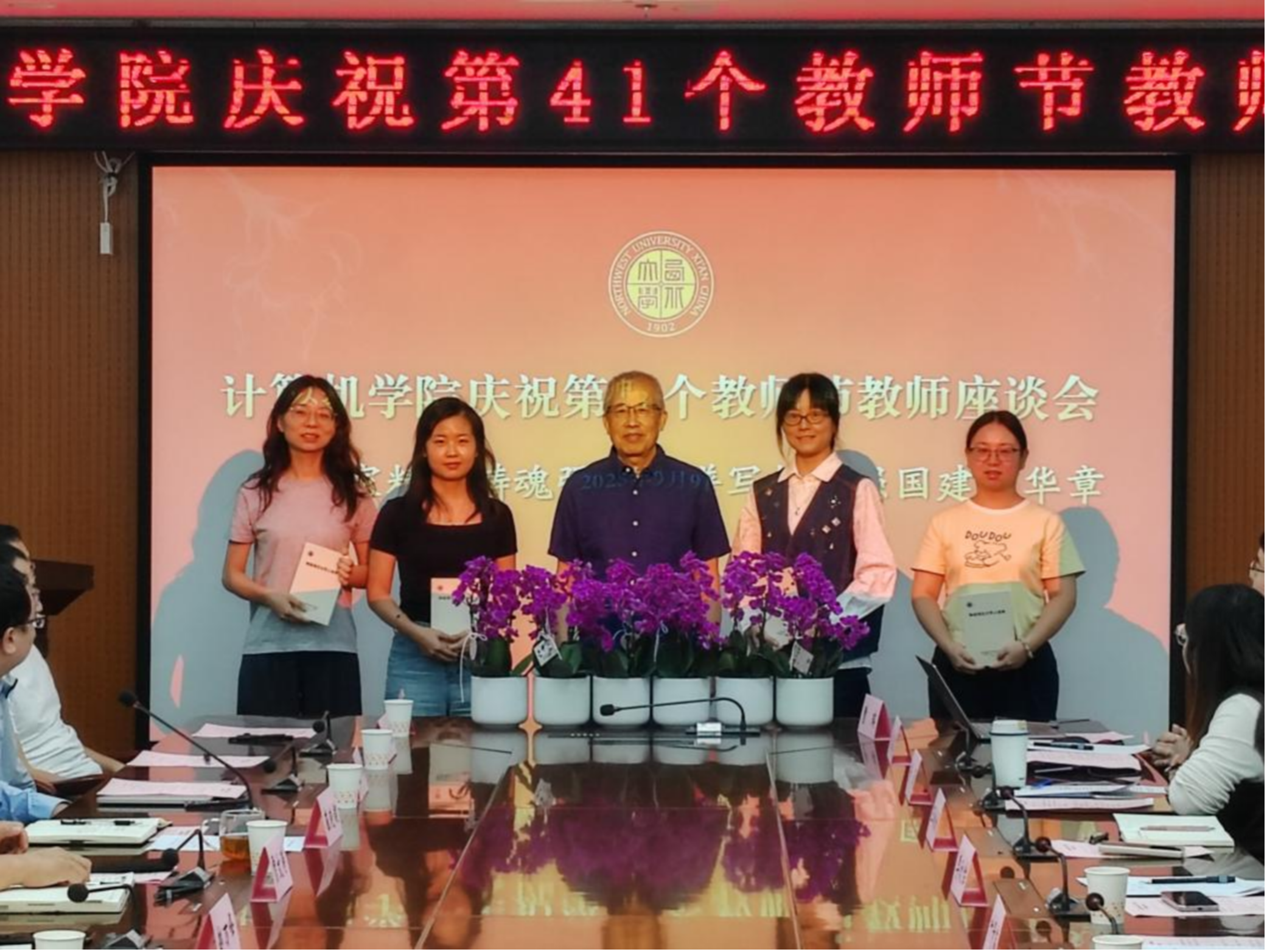 学校通过表彰先进、学习楷模等,弘扬尊师重教传统,发挥榜样引领示范作用。教师节前夕,学校领导看望慰问教师代表,向他们致以节日的祝福和诚挚的问候。9月10日,学校召开2025年教师节表彰座谈会,表彰第四批“全国高校黄大年式教师团队”代表、新增国家级高层次人才、师德师风先进、优秀教师和先进工作者等。多个院系开展向榜样学习活动,计算机学院(软件学院)开展教师节庆祝活动,邀请国家级教学名师分享从教五十载的育人感悟,引导广大教师弘扬教育家精神,爱岗敬业、教书育人,以实干谱写教育强国建设华章。历史学院召开师德师风报告会,邀请陕西省师德标兵分享数十载从教经历与工作思考。数学学院举行优秀教师表彰会,开展师生互动趣味游戏与手工DIY活动,增进了师生之间的交流,营造了尊师爱生的良好氛围。马克思主义学院召开教师节座谈会,向从教满30年的教师和荣休教师赠送鲜花,表达崇高敬意和诚挚感谢。附属中学举行开学典礼暨教师节表彰大会,表彰优秀师生,凝聚发展合力;召开高中新老班主任经验分享交流会,提高教师教学和管理水平。