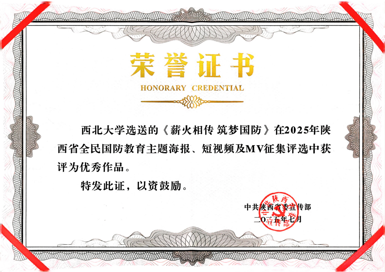 近日,由中共陕西省委宣传部组织的“2025年陕西省全民国防教育主题海报、短视频及MV征集评选”结果揭晓,米兰买球选送的作品《薪火相传筑梦国防》获评“优秀作品”。