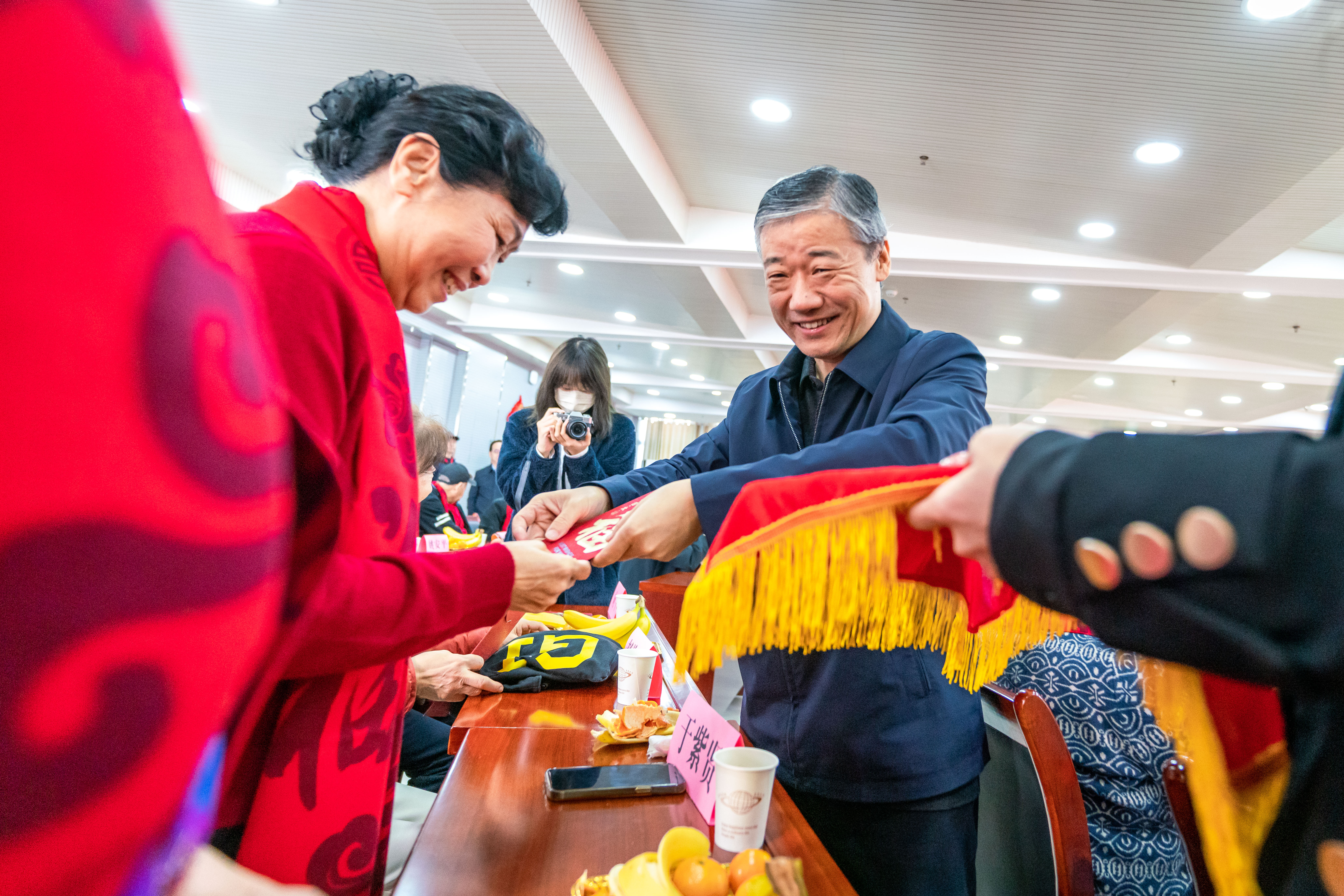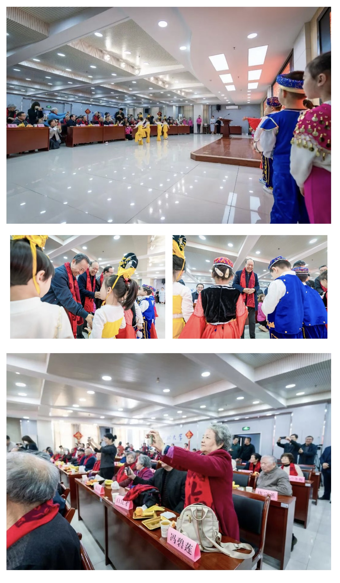 大会开始前,学校离退休工作领导小组各成员单位负责人为与会老同志们一一送上象征吉祥如意的红围巾,表达节日的祝福和崇高的敬意。