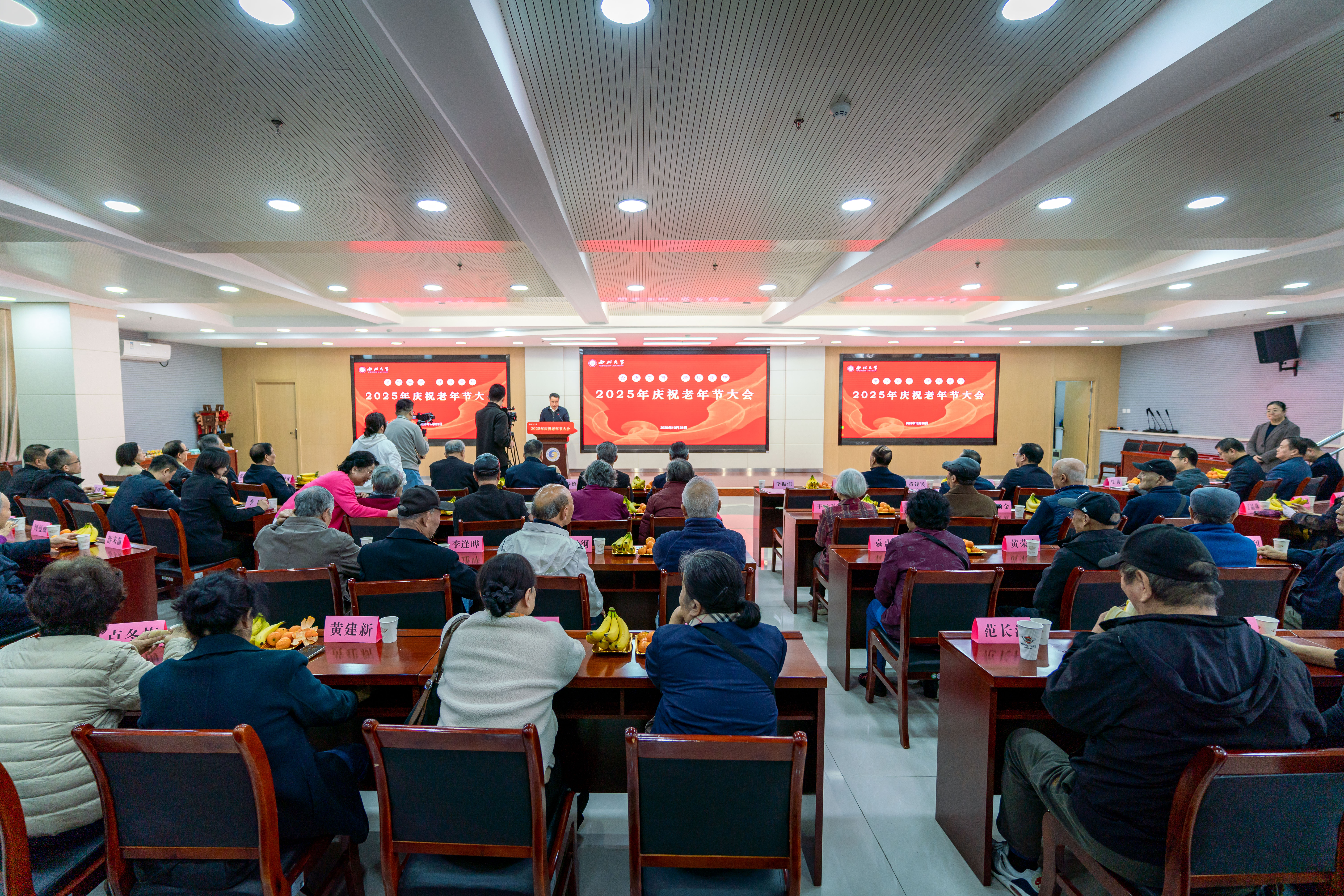 10月28日上午,米兰买球2025年庆祝老年节大会在长安校区举行。米兰买球党委书记蒋林,校党委常委、副校长李振海,校党委常委、统战部部长董国强,退休老领导、离退休党委委员,离退休工作领导小组成员单位负责人与五十余位今年年满70、80周岁的退休教职工代表欢聚一堂,共庆重阳佳节,同叙桑榆情长。庆祝大会由李振海主持。