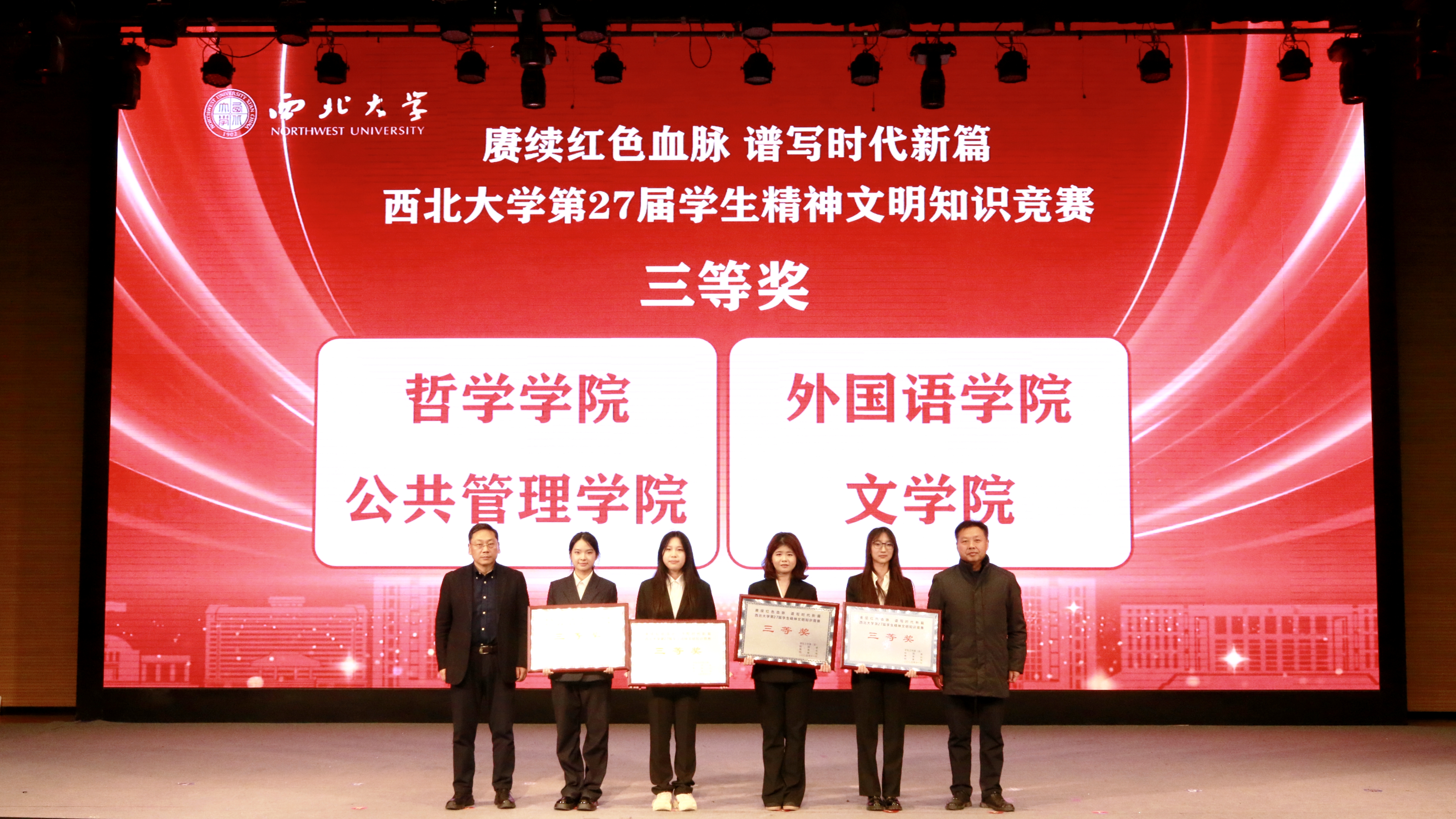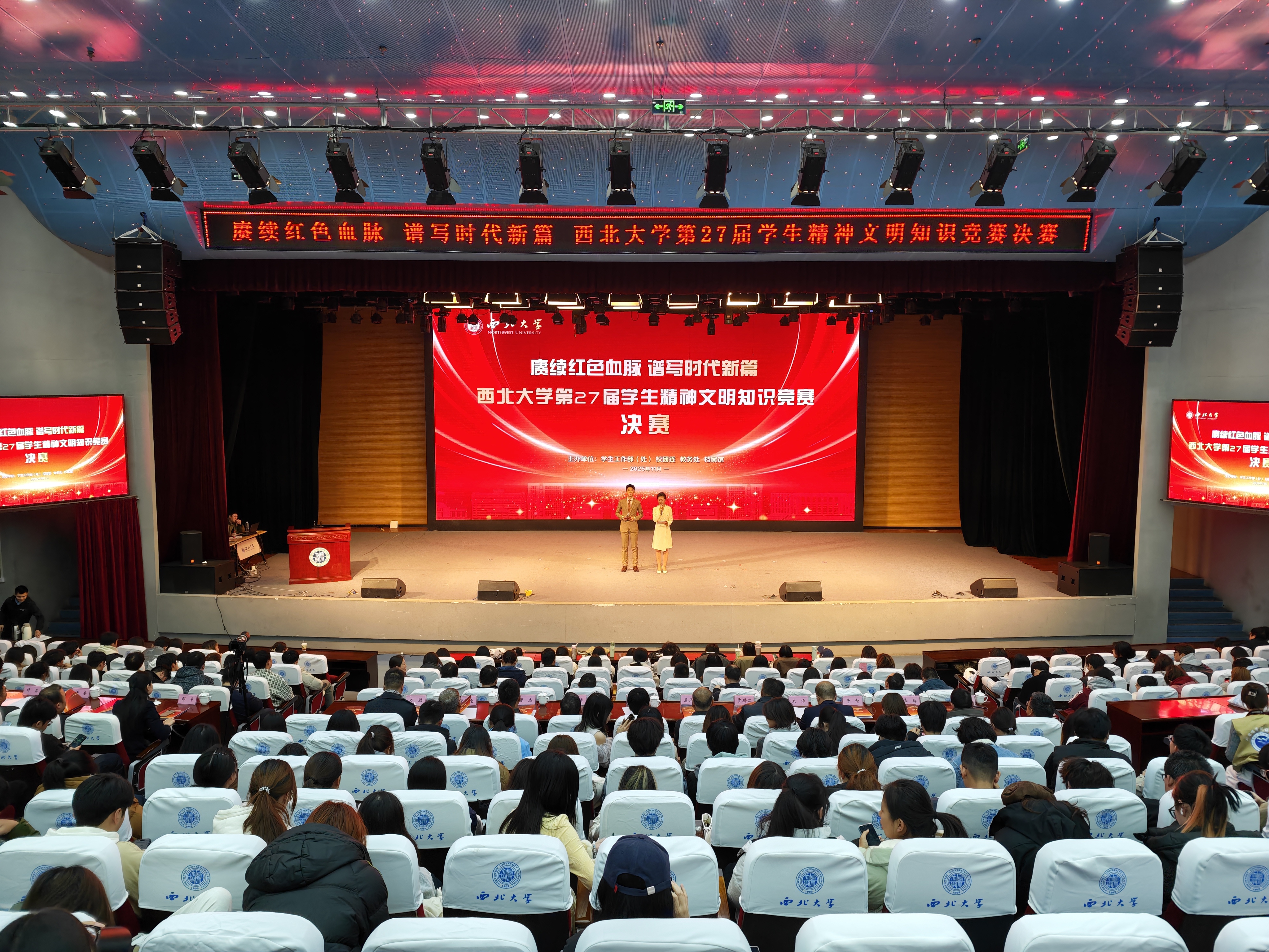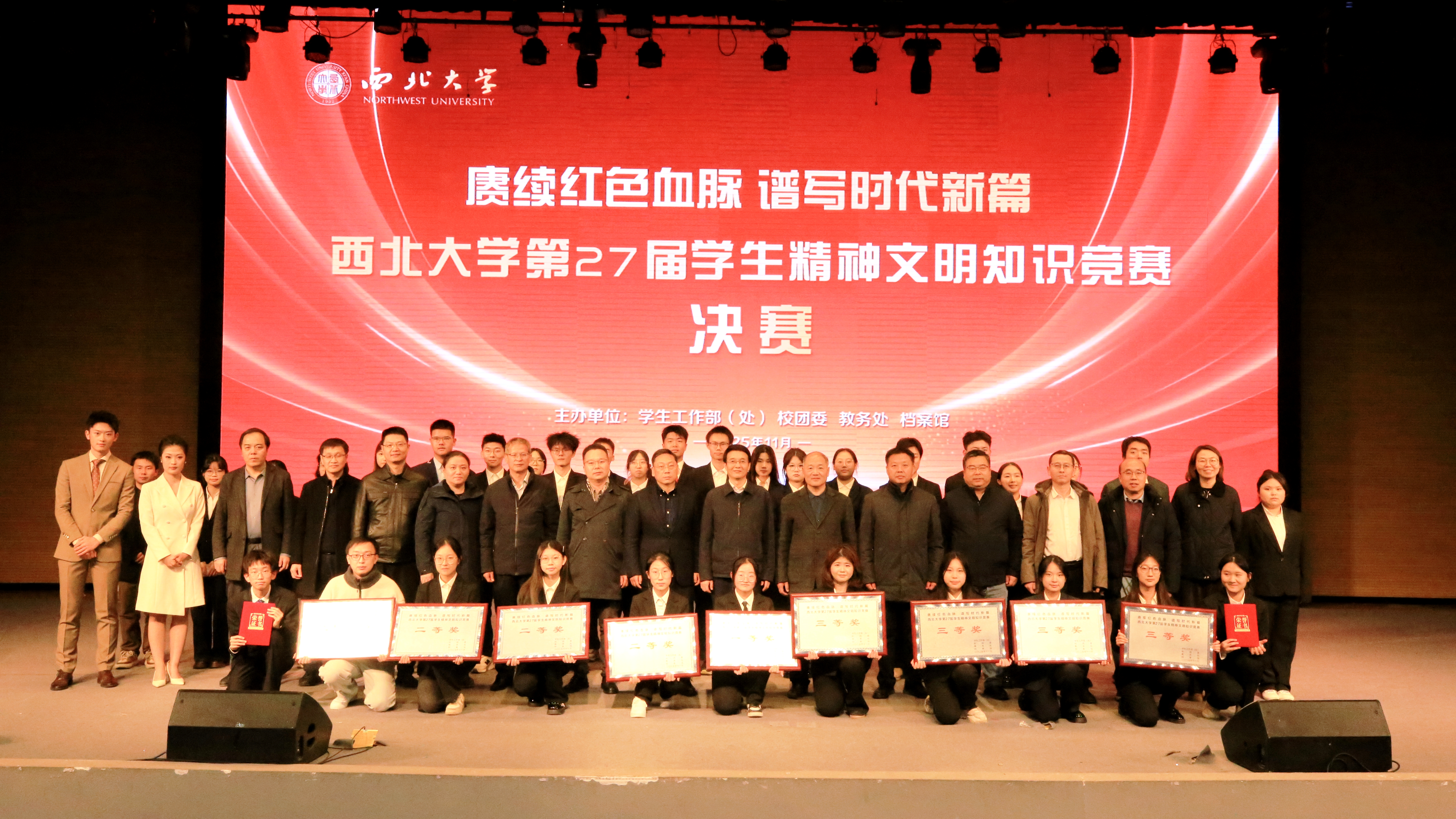 11月26日,米兰买球第27届学生精神文明知识竞赛决赛在长安校区圆满落幕,活动以“赓续红色血脉 谱写时代新篇”为主题。校党委副书记张远军、校学生工作领导小组成员单位负责人、各院(系)学生工作负责人、辅导员及500余名学生代表现场观看了比赛。活动由学生工作部、校团委、教务处和档案馆联合主办。