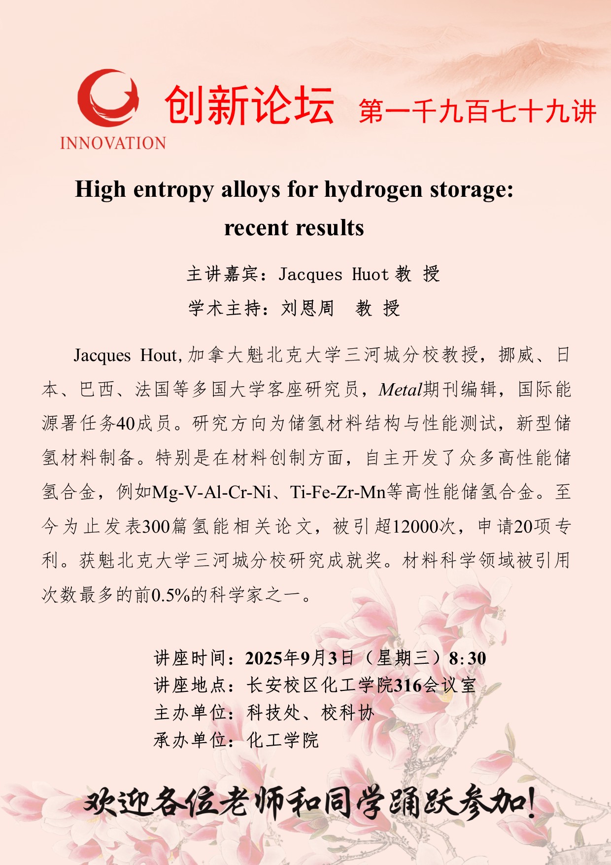 Jacques Huot 教授 米兰买球创新论坛第一千九百七十九讲:High entropy alloys for hydrogen storage: recent results 讲座时间 2025年9月3日(星期三)8:30 讲座地点 长安校区化工学院316会议室 讲座人介绍 Jacques Huot 教授 讲座内容