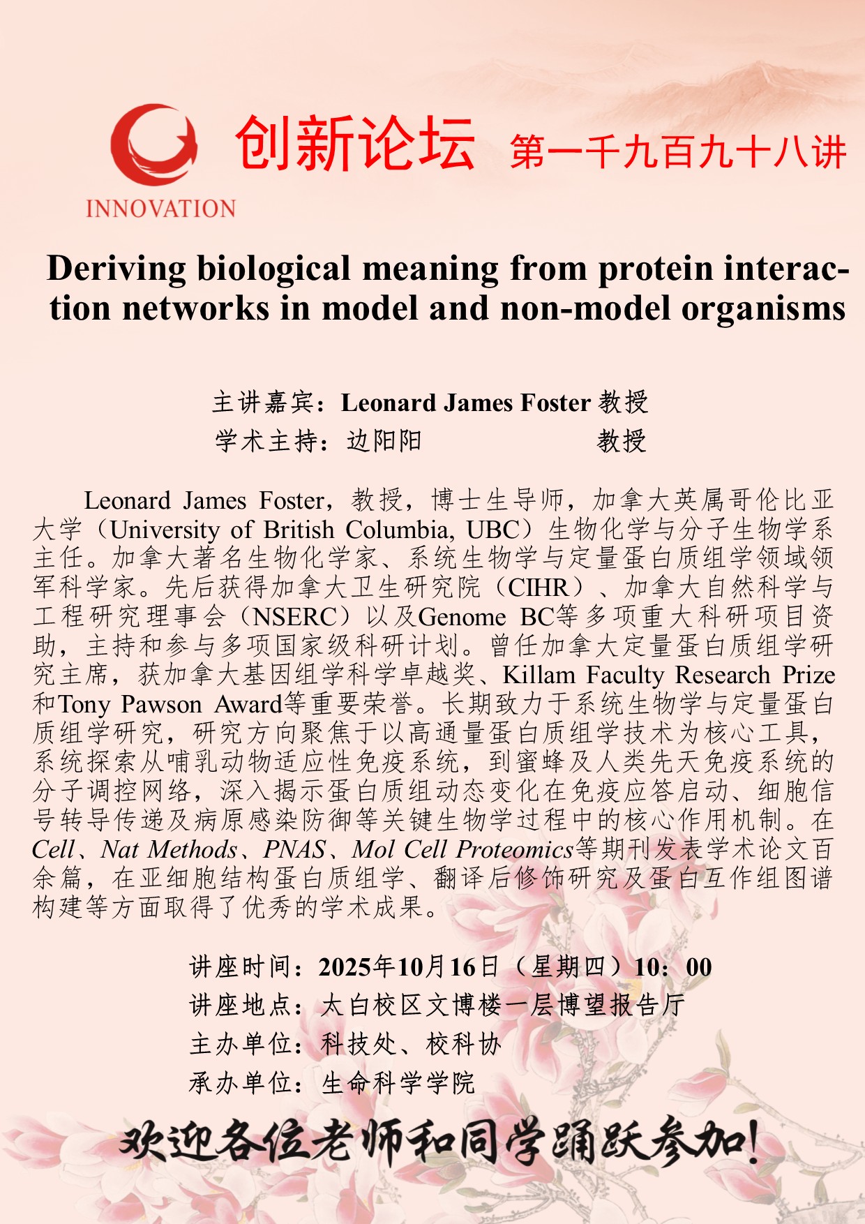 Leonard James Foster 教授 米兰买球创新论坛第一千九百九十八讲:Deriving biological meaning from protein interaction networks in model and non-model organisms 讲座时间 2025年10月16日(星期四)10:00 讲座地点 太白校区文博楼一层博望报告厅 讲座人介绍 Leonard James Foster 教授 讲座内容