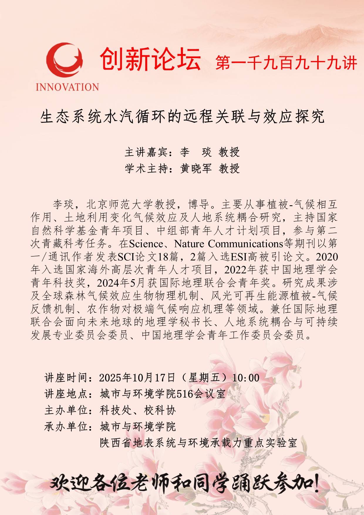 李 琰 教授 米兰买球创新论坛第一千九百九十九讲:生态系统水汽循环的远程关联与效应探究 讲座时间 2025年10月17日(星期五)10:00 讲座地点 城市与环境学院516会议室 讲座人介绍 李 琰 教授 讲座内容
