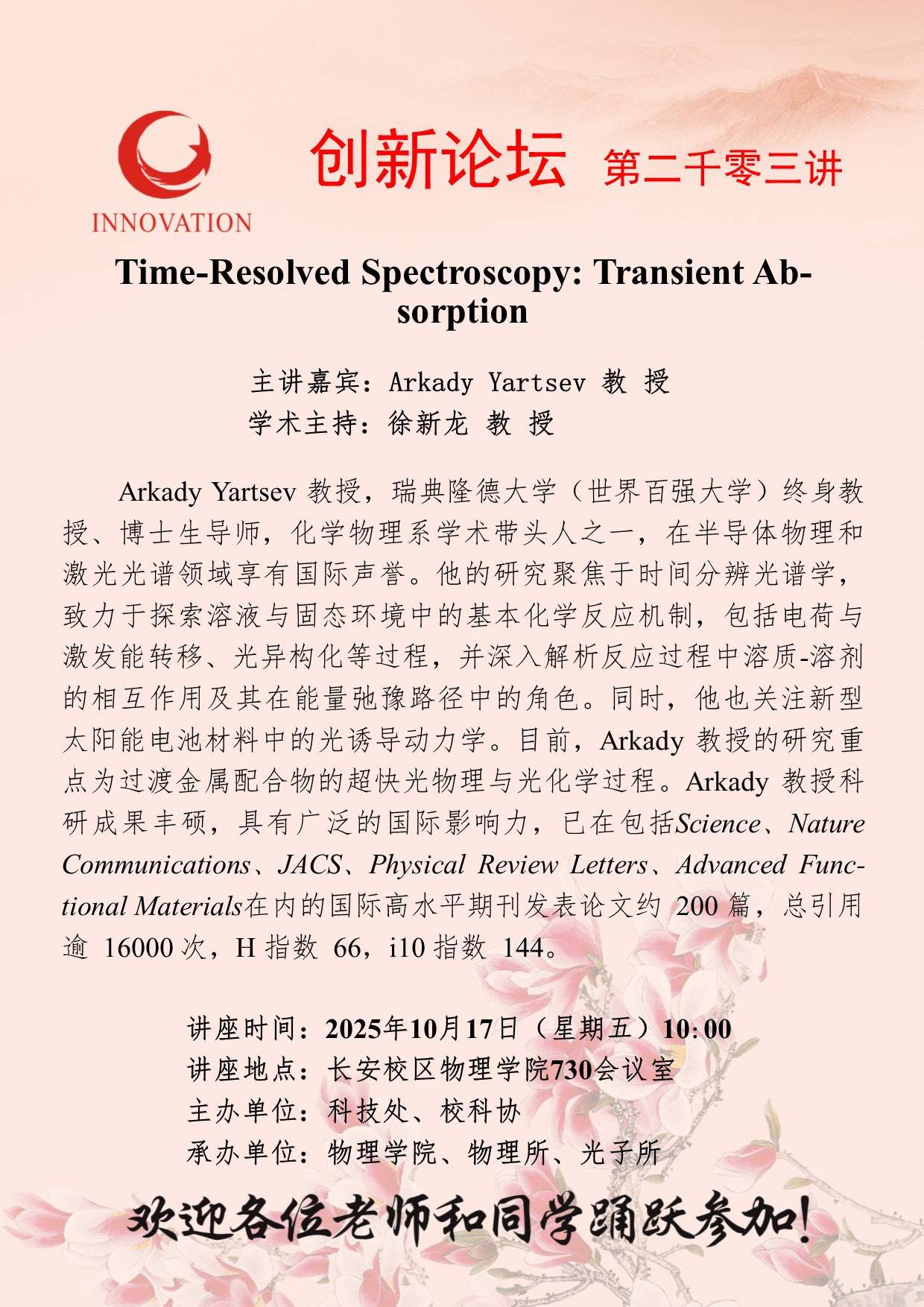 Arkady Yartsev 教授 米兰买球创新论坛第二千零三讲:Time-Resolved Spectroscopy: Transient Absorption 讲座时间 2025年10月17日(星期五)10:00 讲座地点 长安校区物理学院730会议室 讲座人介绍 Arkady Yartsev 教授 讲座内容