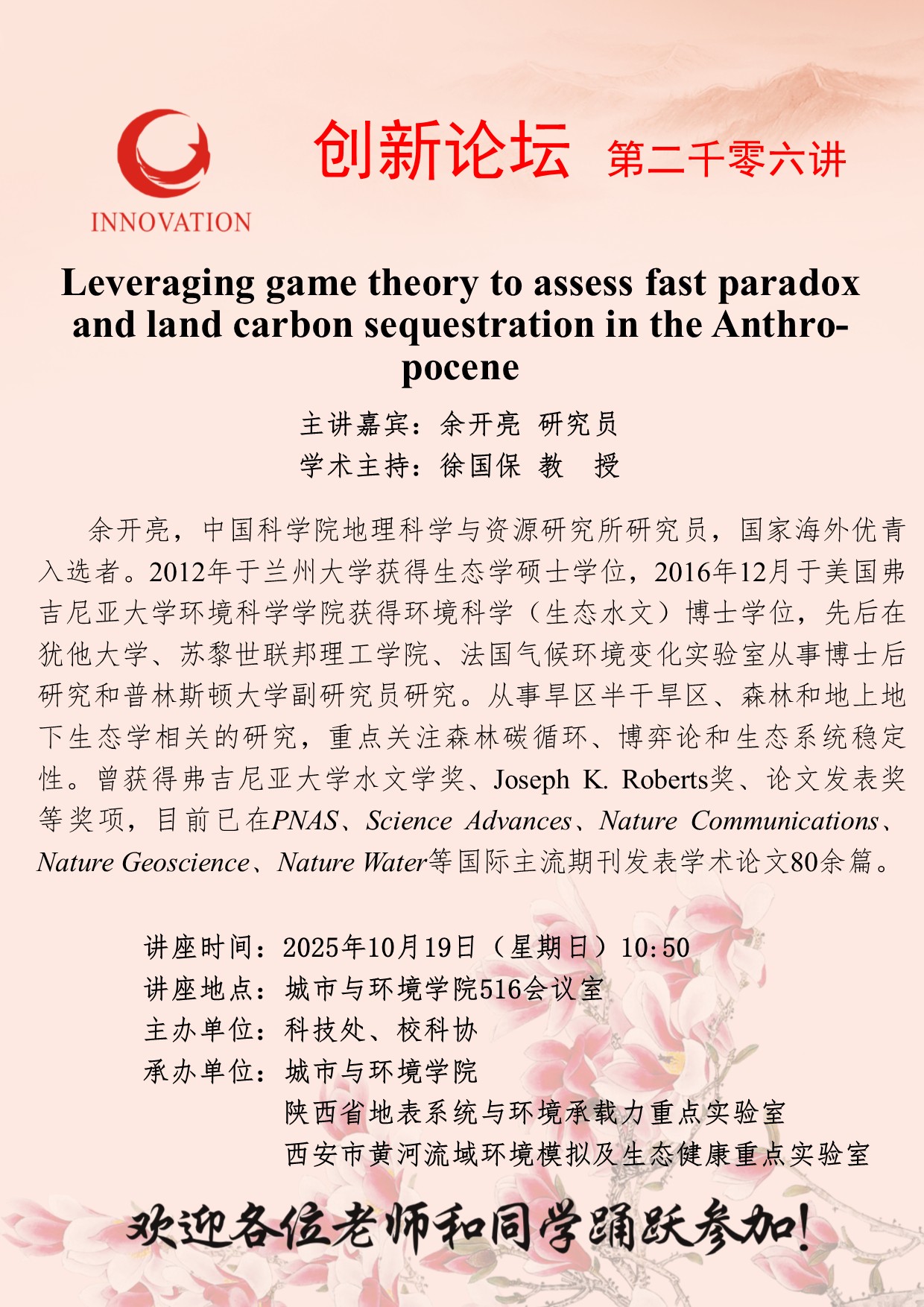 余开亮 研究员 米兰买球创新论坛第二千零六讲:Leveraging game theory to assess fast paradoxand land carbon sequestration in the Anthro-pocene 讲座时间 2025年10月19日(星期日)10:50 讲座地点 城市与环境学院516会议室 讲座人介绍 余开亮 研究员 讲座内容