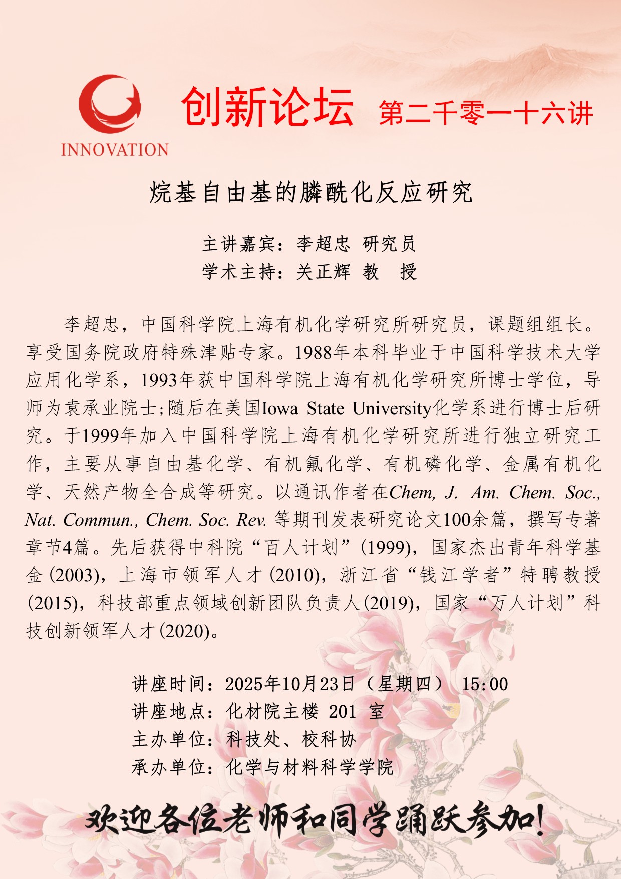 李超忠 研究员 米兰买球创新论坛第二千零一十六讲:烷基自由基的膦酰化反应研究 讲座时间 2025年10月23日(星期四) 15:00 讲座地点 化材院主楼 201 室 讲座人介绍 李超忠 研究员 讲座内容