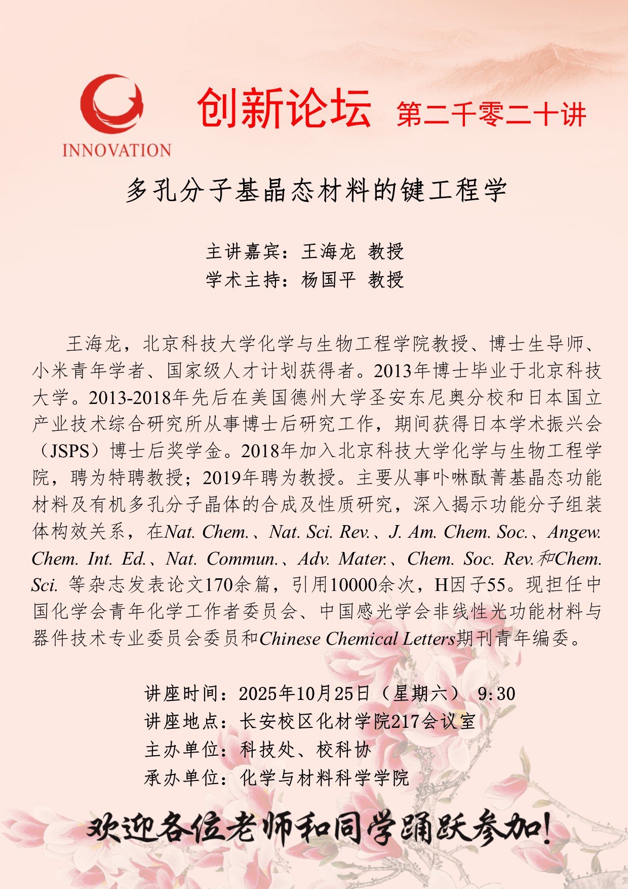 王海龙 教授 米兰买球创新论坛第二千零二十讲:多孔分子基晶态材料的键工程学 讲座时间 2025年10月25日(星期六) 9:30 讲座地点 长安校区化材学院217会议室 讲座人介绍 王海龙 教授 讲座内容