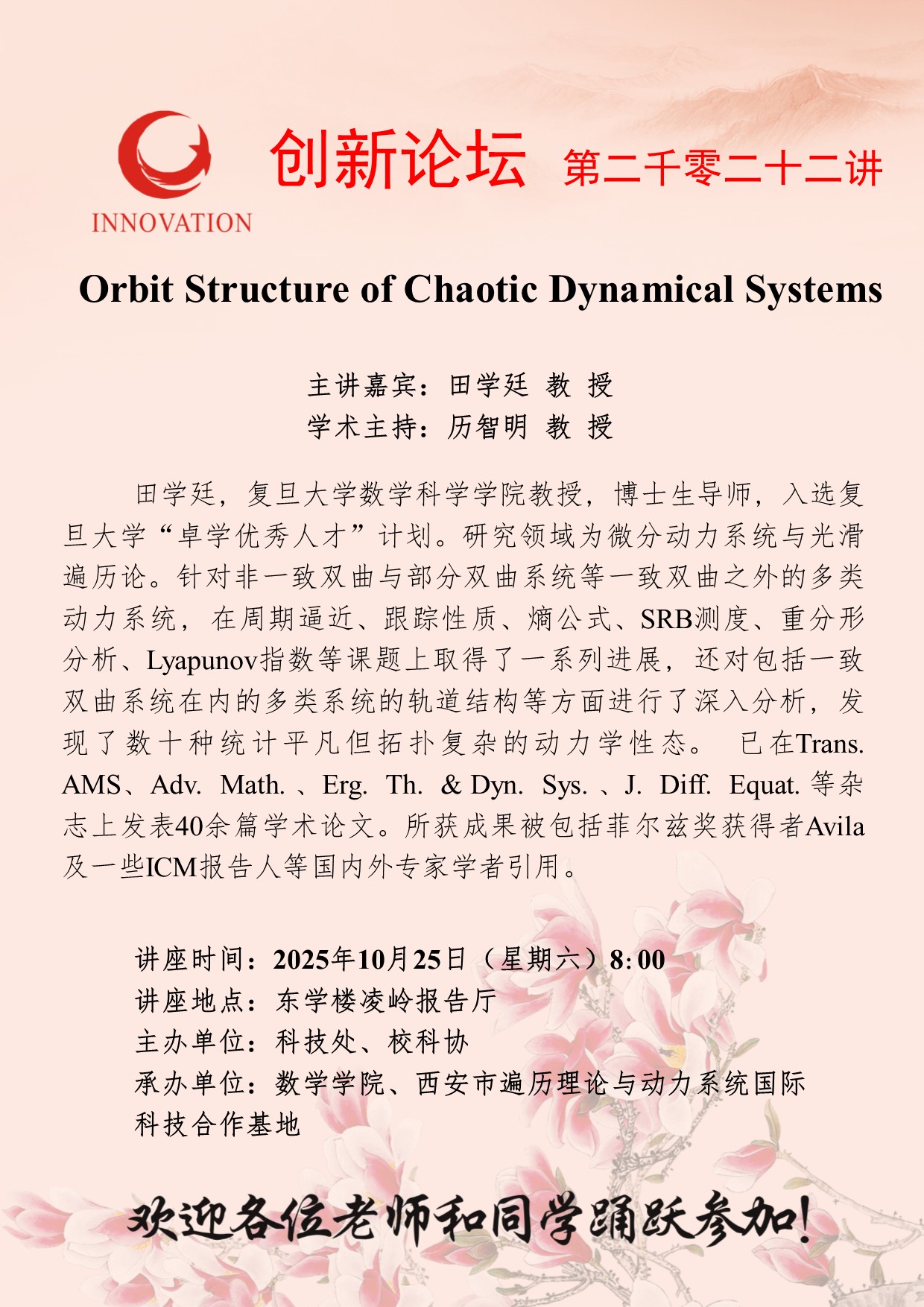 田学廷 教 授 米兰买球创新论坛第二千零二十二讲:Orbit Structure of Chaotic Dynamical Systems 讲座时间 2025年10月25日(星期六)8:00 讲座地点 东学楼凌岭报告厅 讲座人介绍 田学廷 教 授 讲座内容