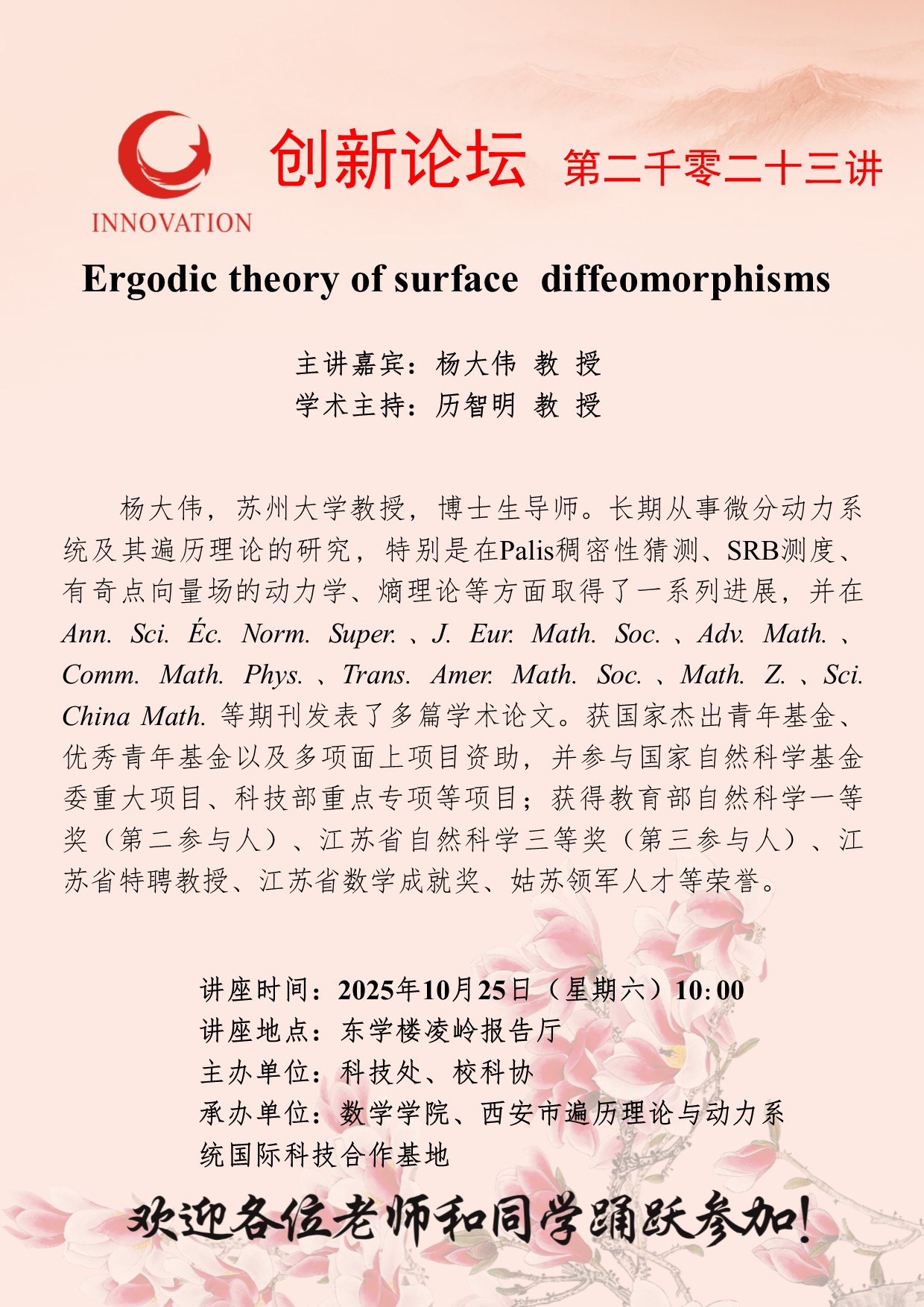 杨大伟 教 授 米兰买球创新论坛第二千零二十三讲:Ergodic theory of surface diffeomorphisms 讲座时间 2025年10月25日(星期六)10:00 讲座地点 东学楼凌岭报告厅 讲座人介绍 杨大伟 教 授 讲座内容
