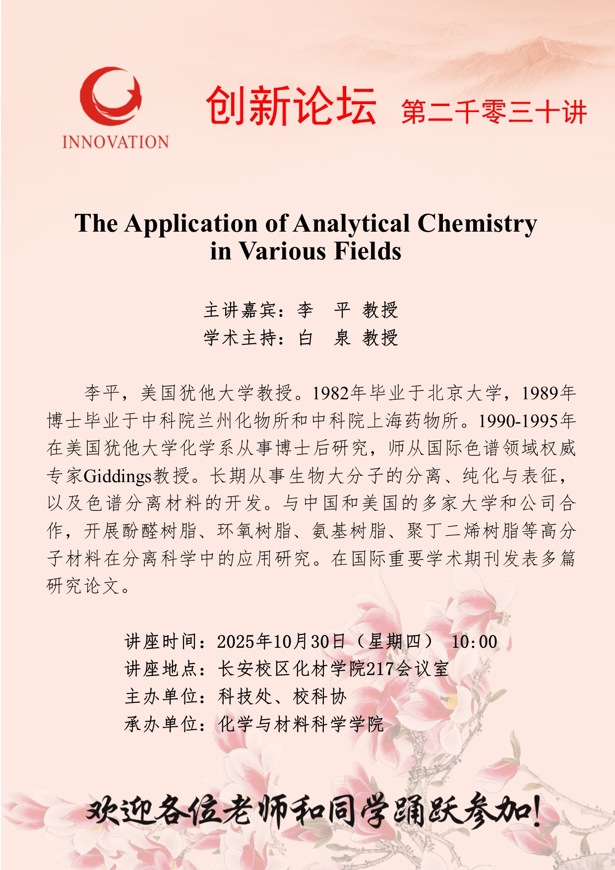 李 平 教授 米兰买球创新论坛第二千零三十讲:The Application of Analytical Chemistry in Various Fields 讲座时间 2025年10月30日(星期四) 10:00 讲座地点 长安校区化材学院217会议室 讲座人介绍 李 平 教授 讲座内容