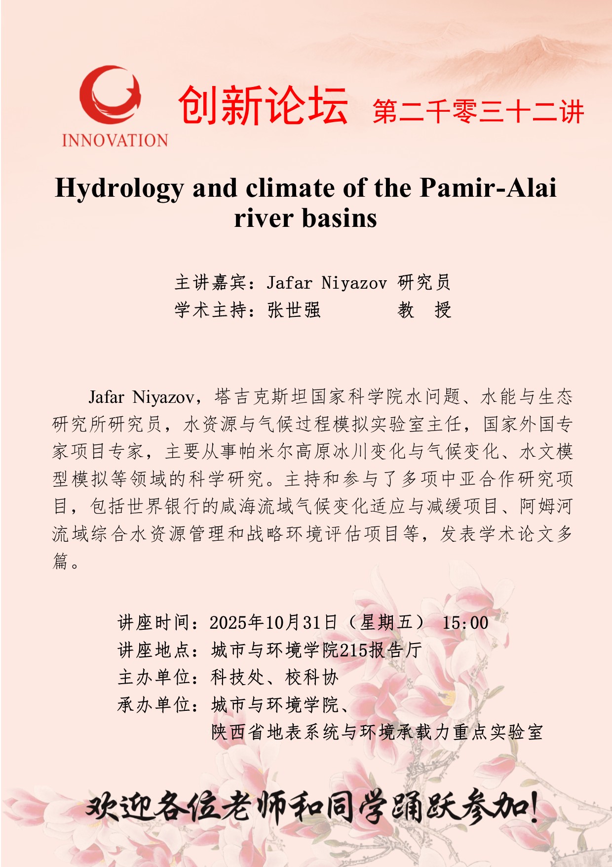 Jafar Niyazov 研究员 米兰买球创新论坛第二千零三十二讲:Hydrology and climate of the Pamir-Alai river basins 讲座时间 2025年10月31日(星期五) 15:00 讲座地点 城市与环境学院215报告厅 讲座人介绍 Jafar Niyazov 研究员 讲座内容