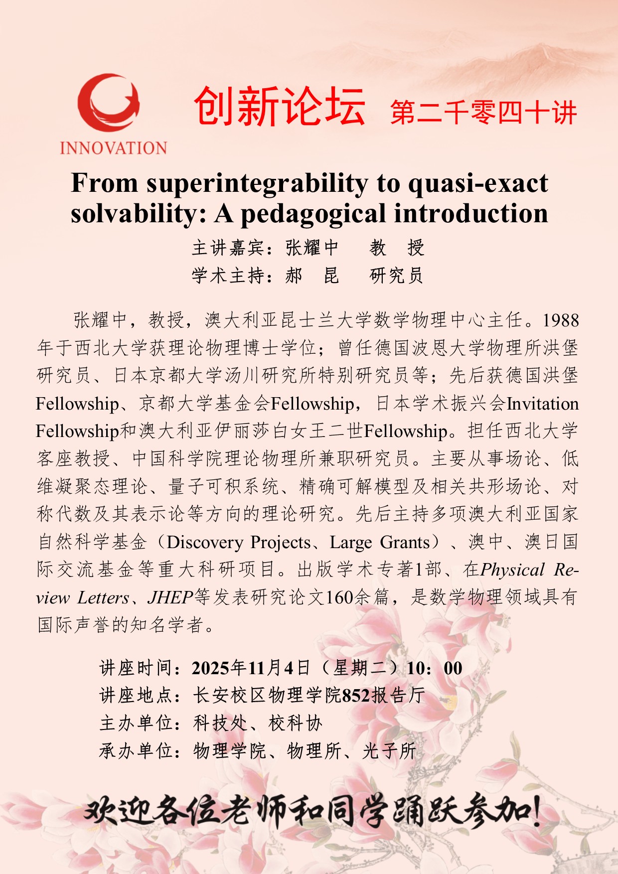 张耀中 教授 米兰买球创新论坛第二千零四十讲:From superintegrability to quasi-exact solvability: A pedagogical introduction 讲座时间 2025年11月4日(星期二)10:00 讲座地点 长安校区物理学院852报告厅 讲座人介绍 张耀中 教授 讲座内容