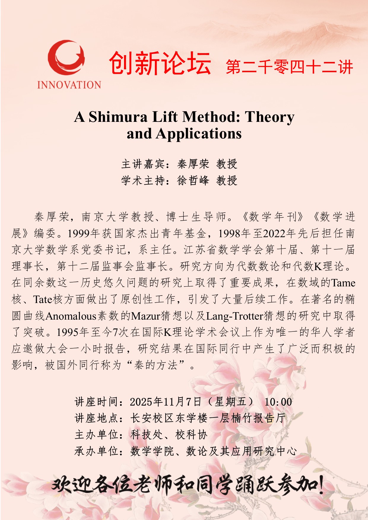 秦厚荣 教授 米兰买球创新论坛第二千零四十二讲:A Shimura Lift Method: Theory and Applications 讲座时间 2025年11月7日(星期五) 10:00 讲座地点 长安校区东学楼一层楠竹报告厅 讲座人介绍 秦厚荣 教授 讲座内容