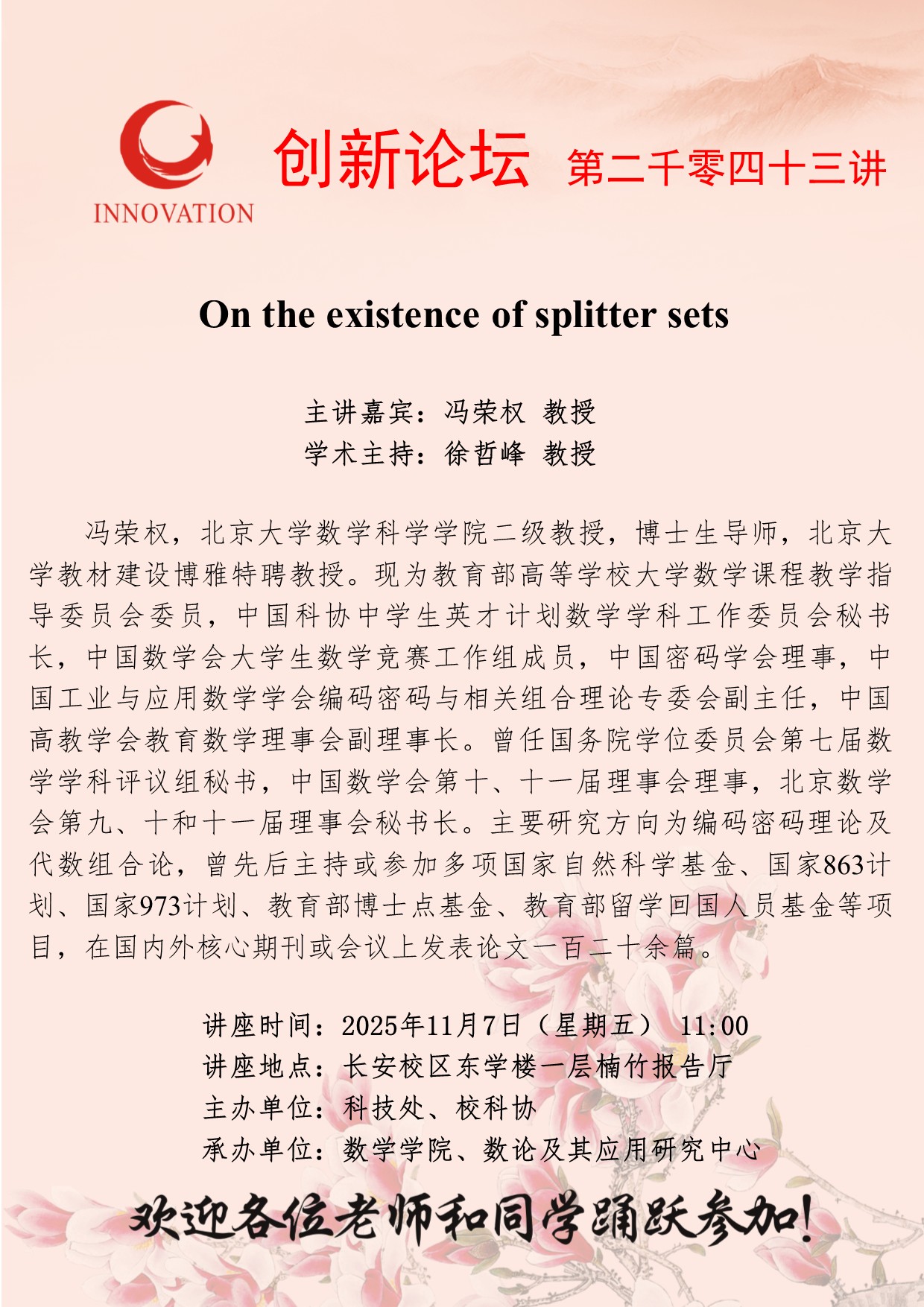 冯荣权 教授 米兰买球创新论坛第二千零四十三讲:On the existence of splitter sets 讲座时间 2025年11月7日(星期五) 11:00 讲座地点 长安校区东学楼一层楠竹报告厅 讲座人介绍 冯荣权 教授 讲座内容