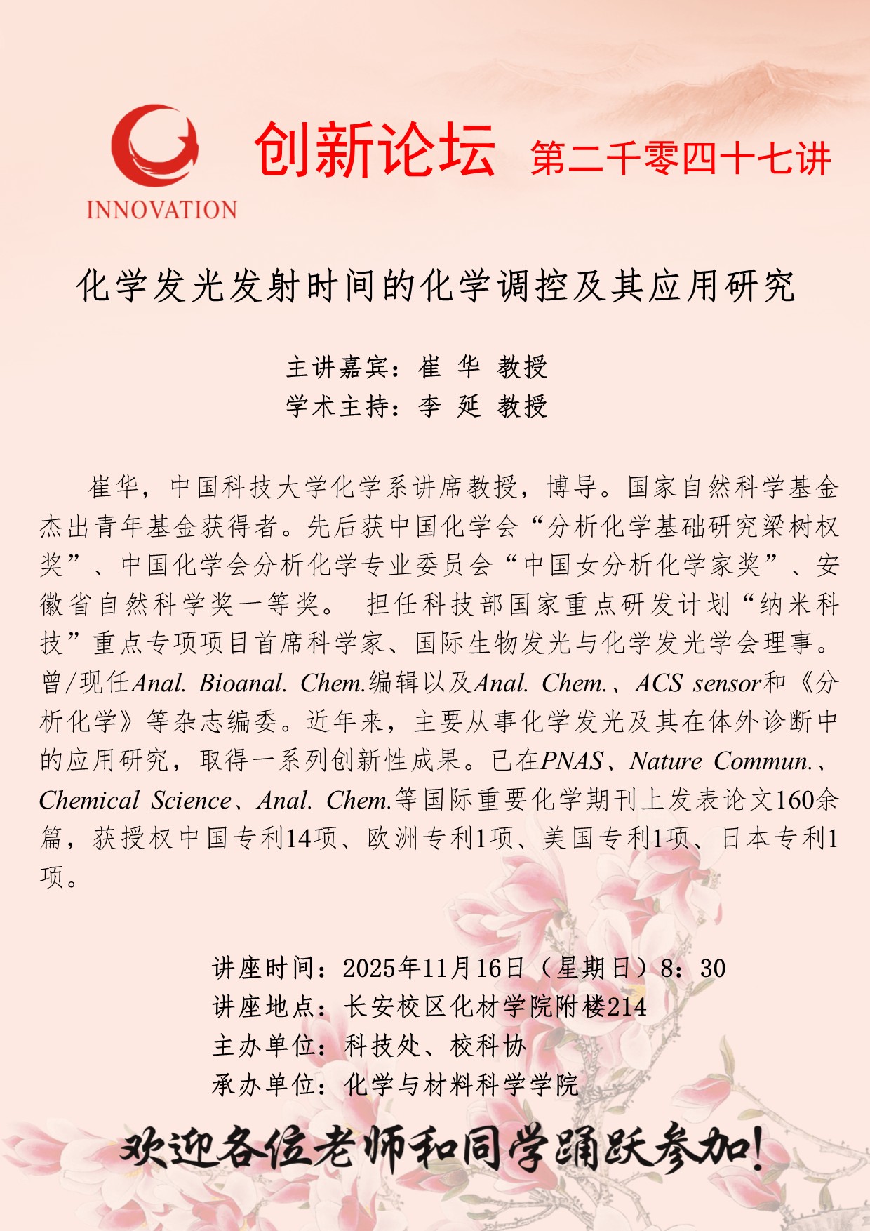 崔华 教授 米兰买球创新论坛第二千零四十七讲:化学发光发射时间的化学调控及其应用研究 讲座时间 2025年11月16日(星期日)8:30 讲座地点 长安校区化材学院附楼214 讲座人介绍 崔华 教授 讲座内容