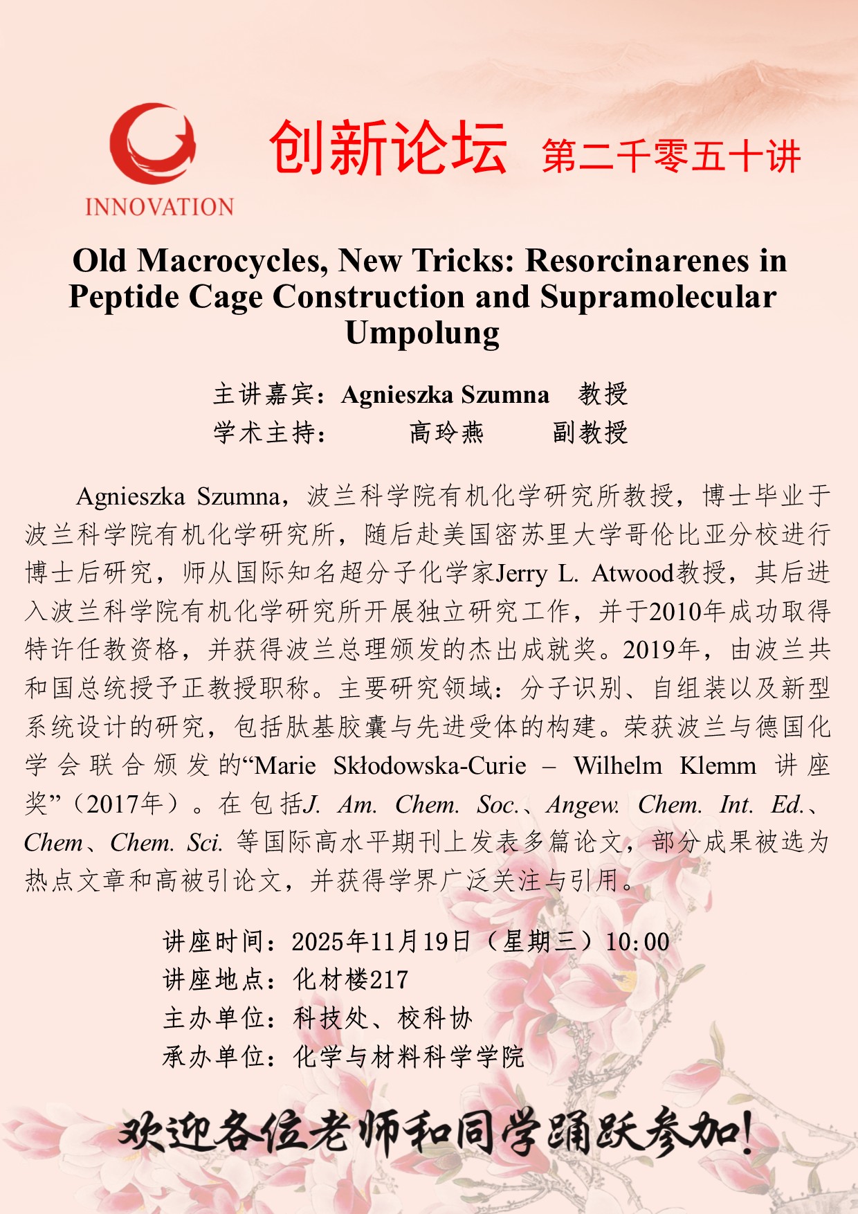 Agnieszka Szumna 教授 米兰买球创新论坛第二千零五十讲:Old Macrocycles, New Tricks: Resorcinarenes in Peptide Cage Construction and Supramolecular Umpolung 讲座时间 2025年11月19日(星期三)10:00 讲座地点 化材楼217 讲座人介绍 Agnieszka Szumna 教授 讲座内容