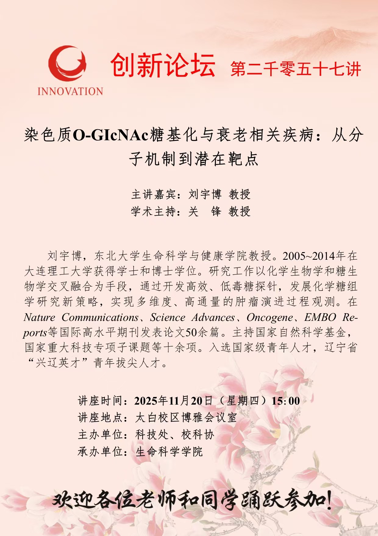 刘宇博 教授 米兰买球创新论坛第二千零五十七讲:染色质O-GIcNAc糖基化与衰老相关疾病:从分子机制到潜在靶点 讲座时间 2025年11月20日(星期四)15:00 讲座地点 太白校区博雅会议室 讲座人介绍 刘宇博 教授 讲座内容