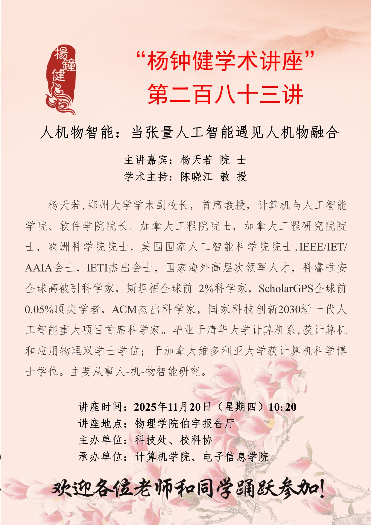 杨天若 院士 “杨钟健学术讲座”第二百八十三讲:人机物智能:当张量人工智能遇见人机物融合 讲座时间 2025年11月20日(星期四)10:20 讲座地点 物理学院伯宇报告厅 讲座人介绍 杨天若 院士 讲座内容
