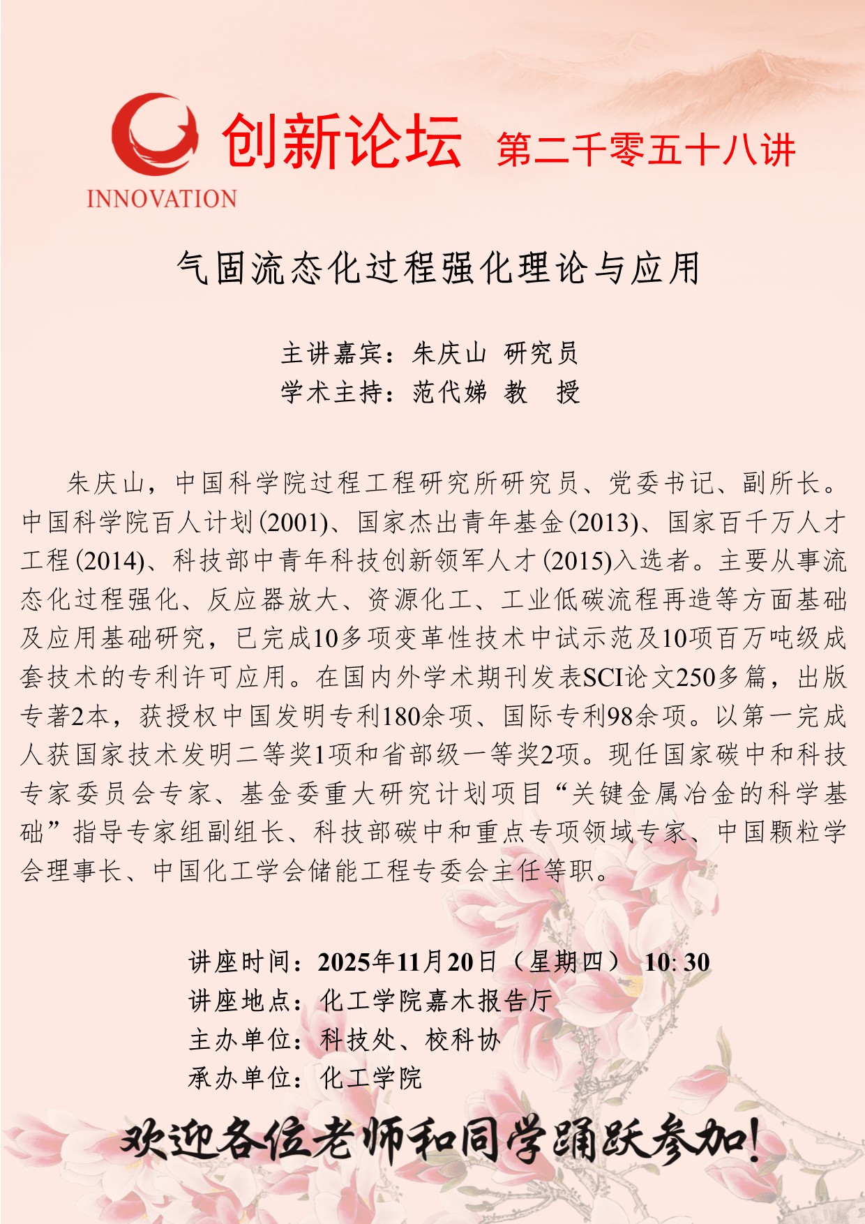 朱庆山 研究员 米兰买球创新论坛第二千零五十八讲:气固流态化过程强化理论与应用 讲座时间 2025年11月20日(星期四) 10: 30 讲座地点 化工学院嘉木报告厅 讲座人介绍 朱庆山 研究员 讲座内容
