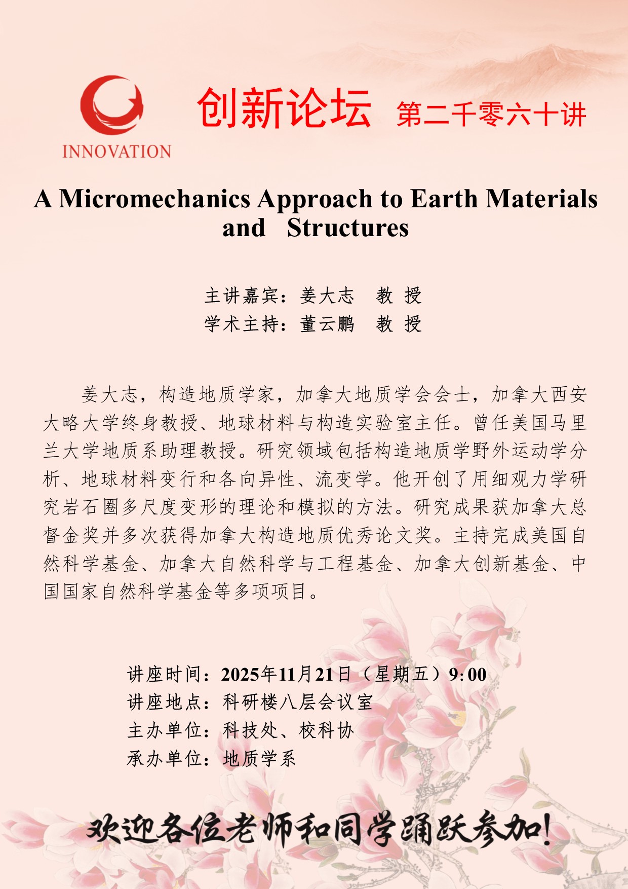 姜大志 教授 米兰买球创新论坛第二千零六十讲:A Micromechanics Approach to Earth Materials and Structures 讲座时间 2025年11月21日(星期五)9:00 讲座地点 科研楼八层会议室 讲座人介绍 姜大志 教授 讲座内容