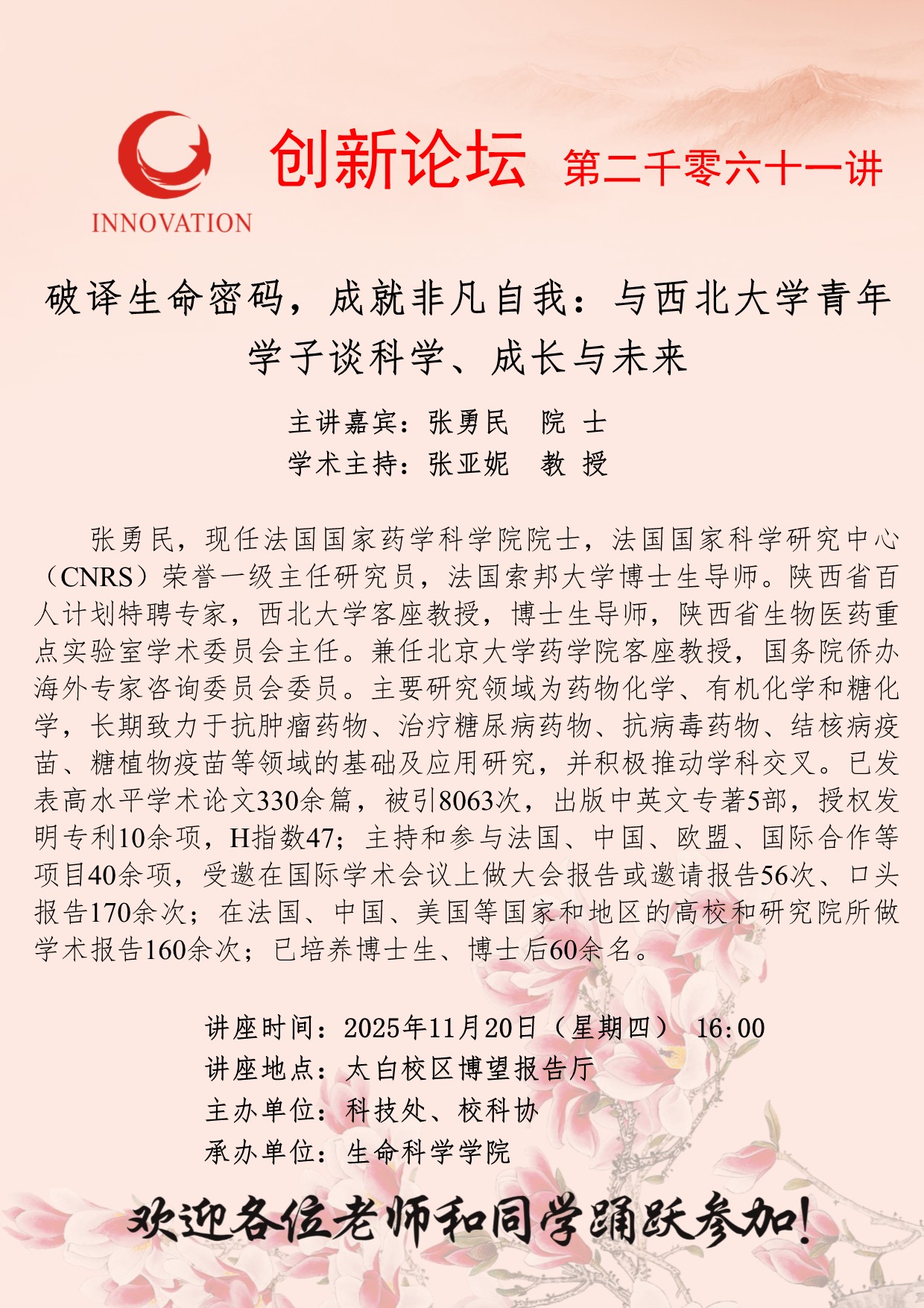 张勇民 院士 米兰买球创新论坛第二千零六十一讲:破译生命密码,成就非凡自我:与米兰买球青年学子谈科学、成长与未来 讲座时间 2025年11月20日(星期四) 16:00 讲座地点 太白校区博望报告厅 讲座人介绍 张勇民 院士 讲座内容