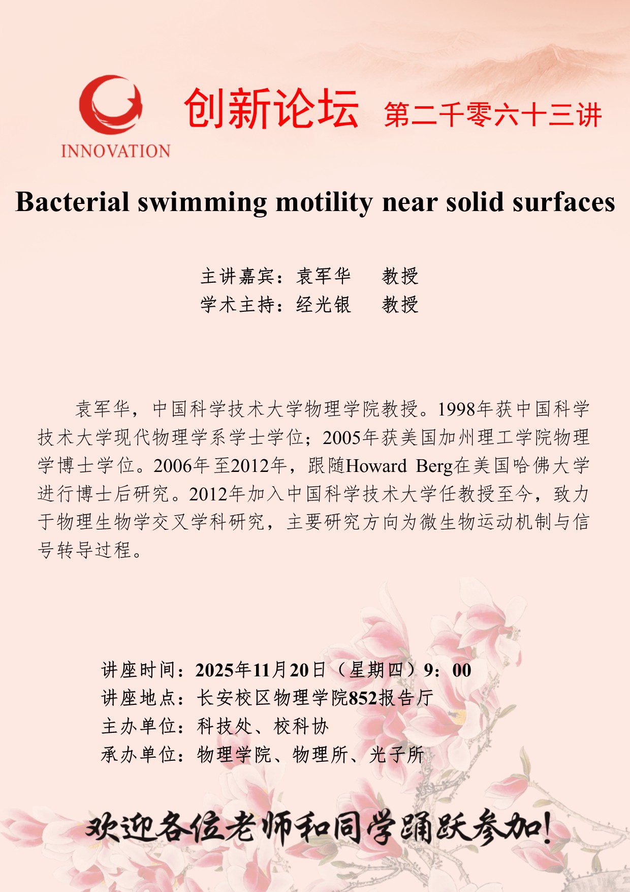 袁军华 教授 米兰买球创新论坛第二千零六十三讲:Bacterial swimming motility near solid surfaces 讲座时间 2025年11月20日(星期四)9:00 讲座地点 长安校区物理学院852报告厅 讲座人介绍 袁军华 教授 讲座内容