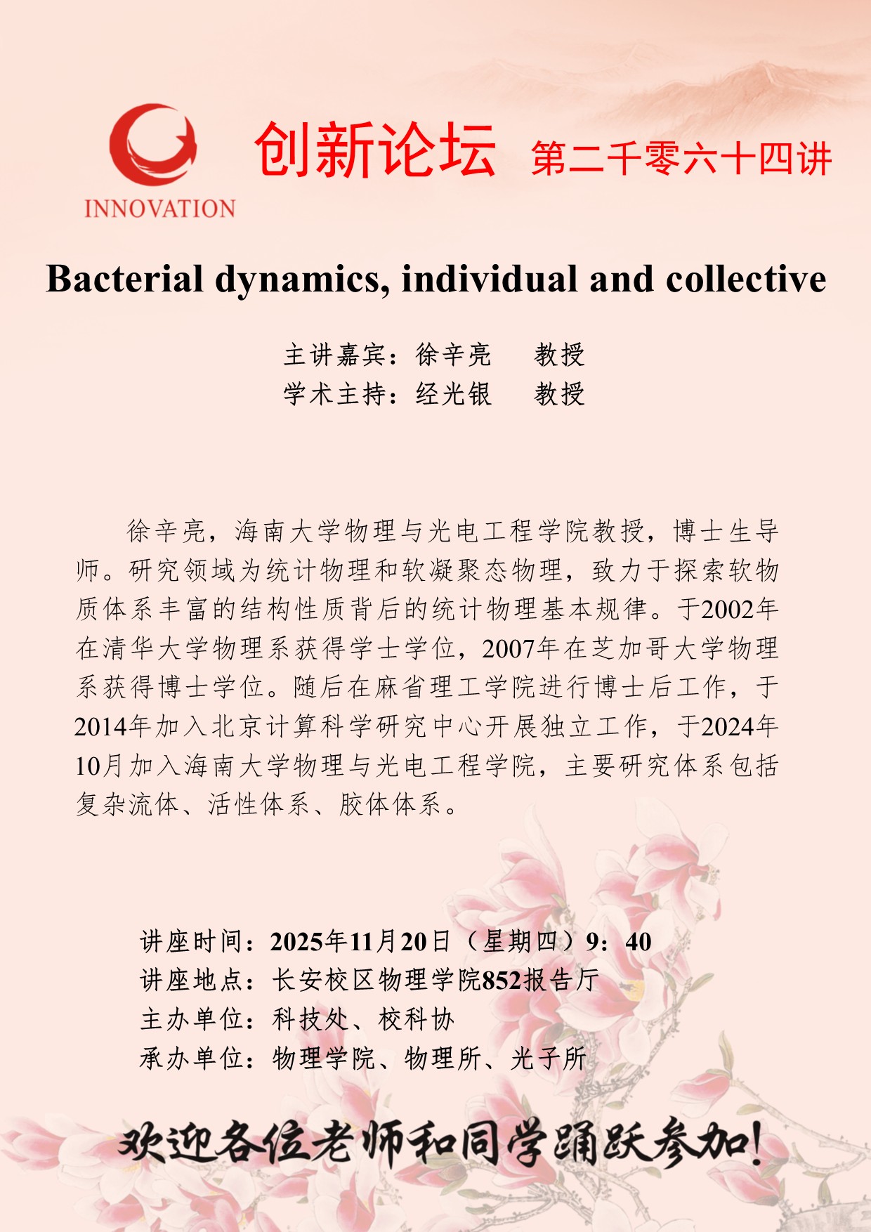 徐辛亮 教授 米兰买球创新论坛第二千零六十四讲:Bacterial dynamics, individual and collective 讲座时间 2025年11月20日(星期四)9:40 讲座地点 长安校区物理学院852报告厅 讲座人介绍 徐辛亮 教授 讲座内容