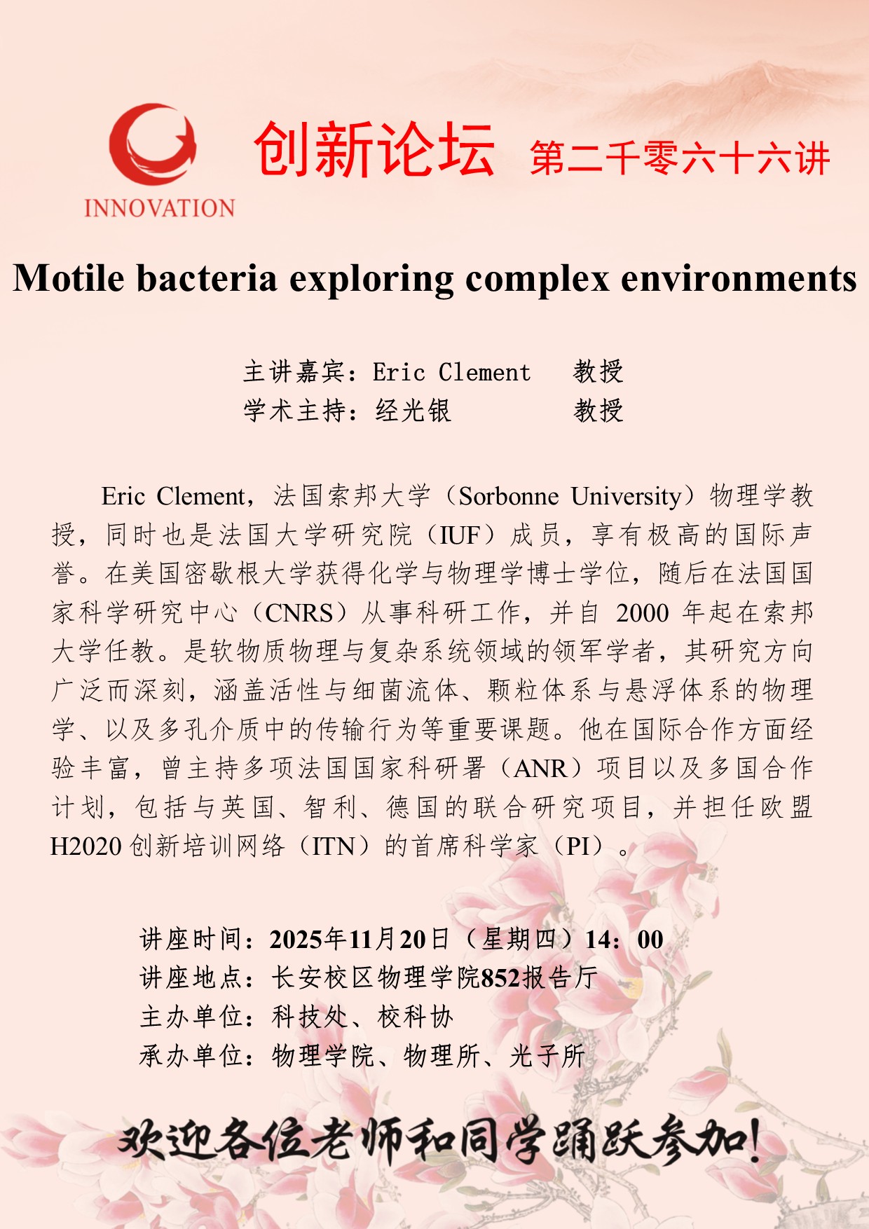 Eric Clement 教授 米兰买球创新论坛第二千零六十六讲:Motile bacteria exploring complex environments 讲座时间 2025年11月20日(星期四)14:00 讲座地点 长安校区物理学院852报告厅 讲座人介绍 Eric Clement 教授 讲座内容