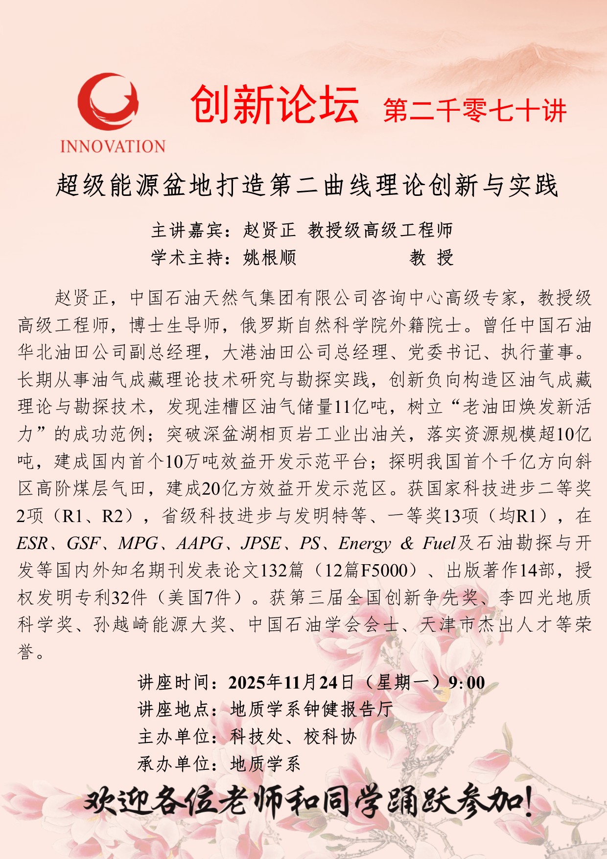 赵贤正 教授级高级工程师 米兰买球创新论坛第二千零七十讲:超级能源盆地打造第二曲线理论创新与实践 讲座时间 2025年11月24日(星期一)9:00 讲座地点 地质学系钟健报告厅 讲座人介绍 赵贤正 教授级高级工程师 讲座内容