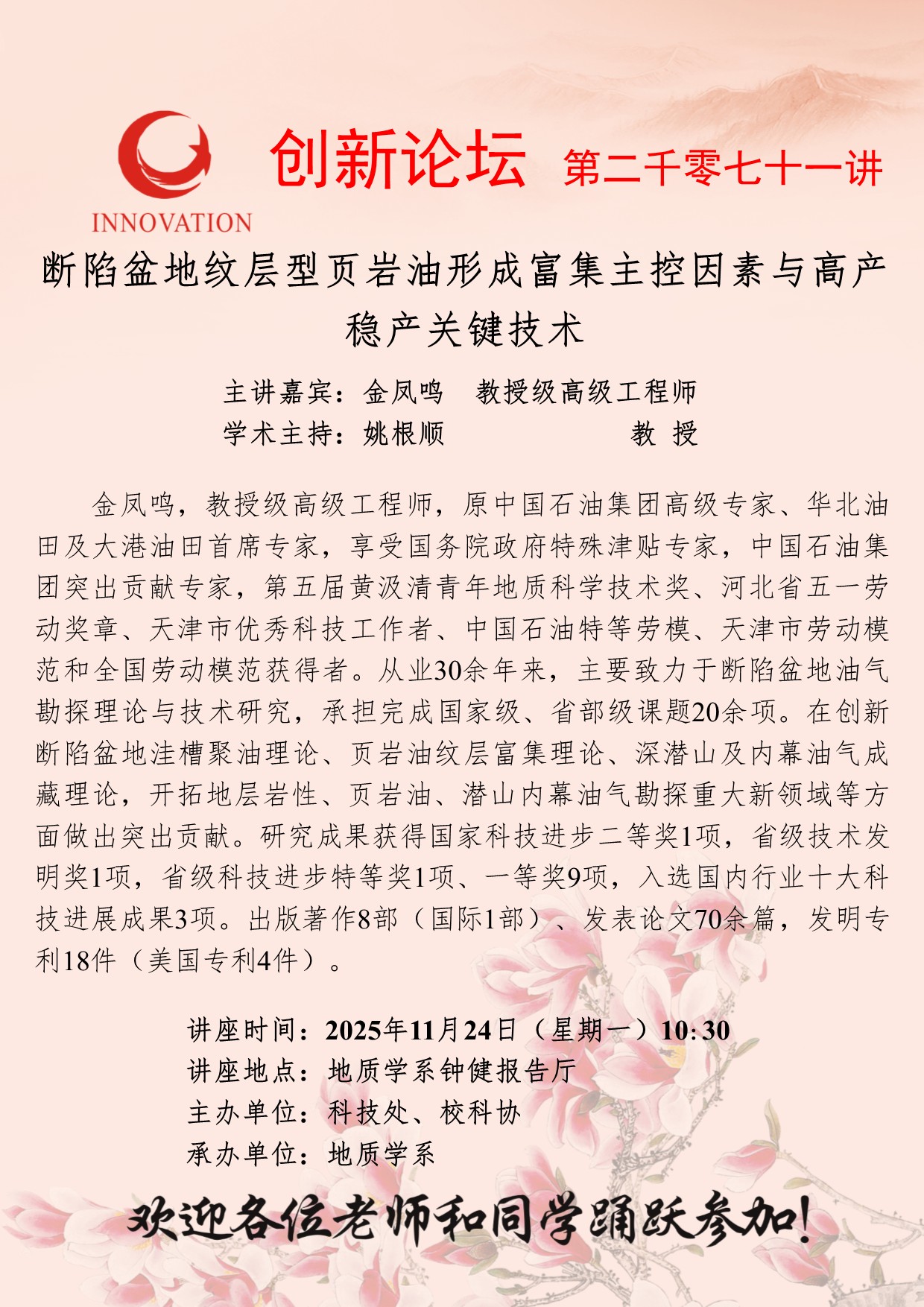 金凤鸣 教授级高级工程师 米兰买球创新论坛第二千零七十一讲:断陷盆地纹层型页岩油形成富集主控因素与高产稳产关键技术 讲座时间 2025年11月24日(星期一)10:30 讲座地点 地质学系钟健报告厅 讲座人介绍 金凤鸣 教授级高级工程师 讲座内容