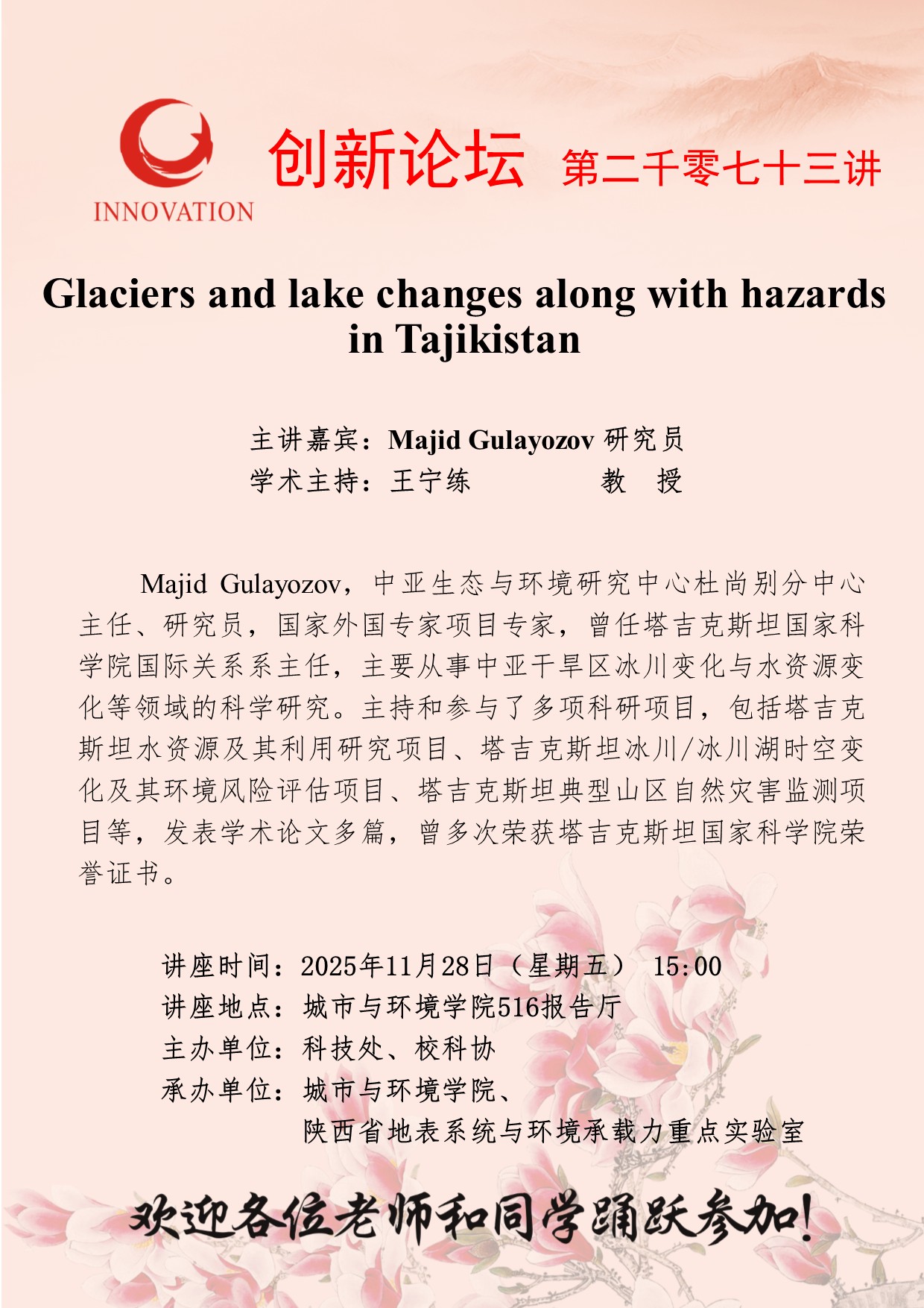 Majid Gulayozov 研究员 米兰买球创新论坛第二千零七十三讲:Glaciers and lake changes along with hazards in Tajikistan 讲座时间 2025年11月28日(星期五) 15:00 讲座地点 城市与环境学院516报告厅 讲座人介绍 Majid Gulayozov 研究员 讲座内容