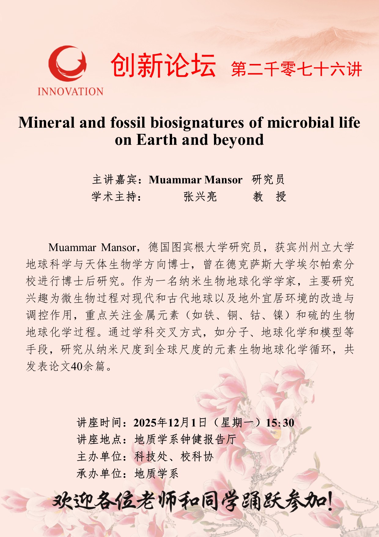 Muammar Mansor 研究员 米兰买球创新论坛第二千零七十六讲:Mineral and fossil biosignatures of microbial life on Earth and beyond 讲座时间 2025年12月1日(星期一)15:30 讲座地点 地质学系钟健报告厅 讲座人介绍 Muammar Mansor 研究员 讲座内容
