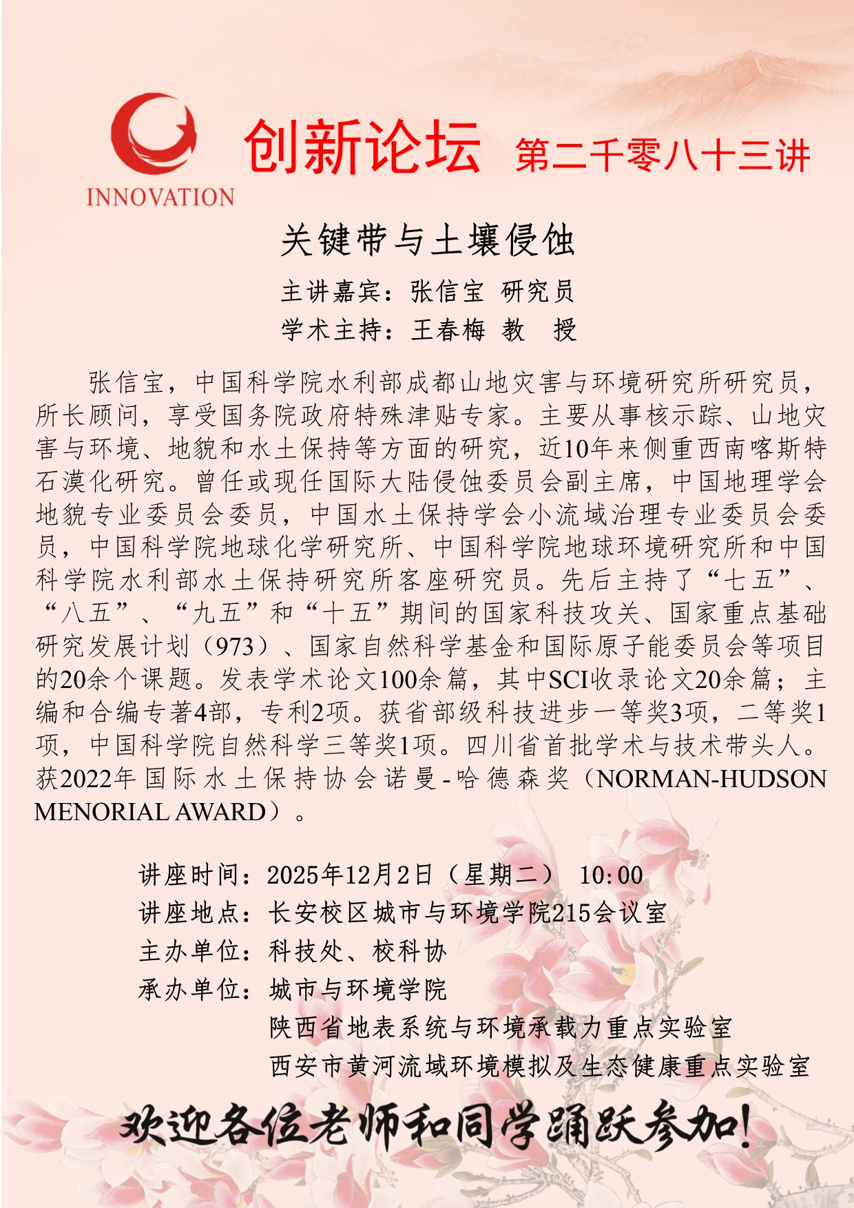 张信宝 研究员 米兰买球创新论坛第二千零八十三讲:关键带与土壤侵蚀 讲座时间 2025年12月02日(星期二) 10:00 讲座地点 长安校区城市与环境学院215会议室 讲座人介绍 张信宝 研究员 讲座内容
