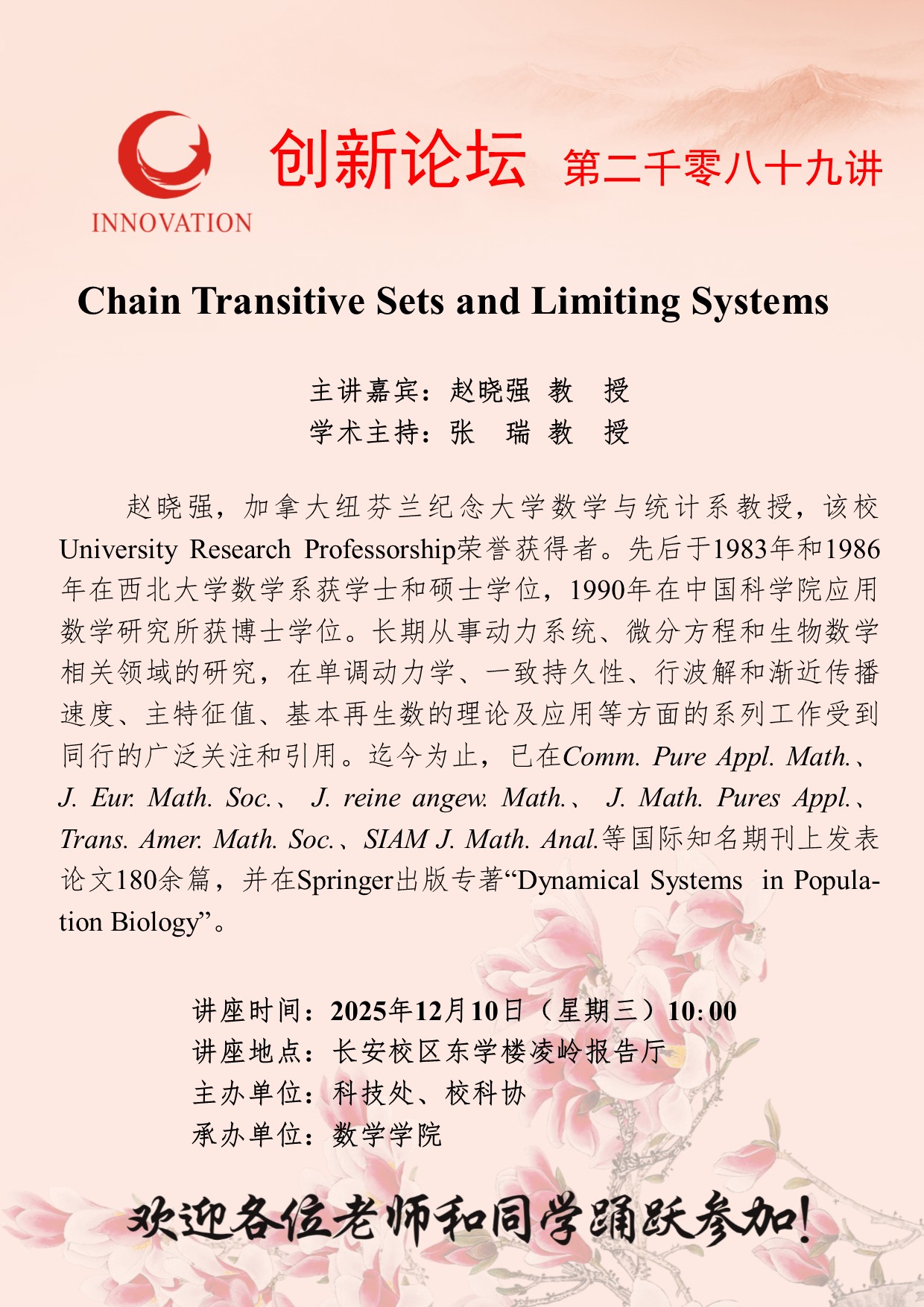 赵晓强 教授 米兰买球创新论坛第二千零八十九讲:Chain Transitive Sets and Limiting Systems 讲座时间 2025年12月10日(星期三)10:00 讲座地点 长安校区东学楼凌岭报告厅 讲座人介绍 赵晓强 教授 讲座内容