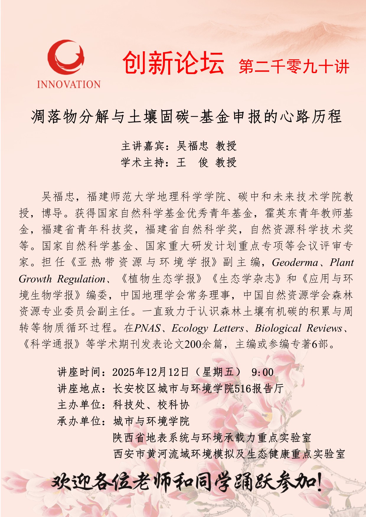 吴福忠 教授 米兰买球创新论坛第二千零九十讲:凋落物分解与土壤固碳-基金申报的心路历程 讲座时间 2025年12月12日(星期五) 9:00 讲座地点 长安校区城市与环境学院516报告厅 讲座人介绍 吴福忠 教授 讲座内容