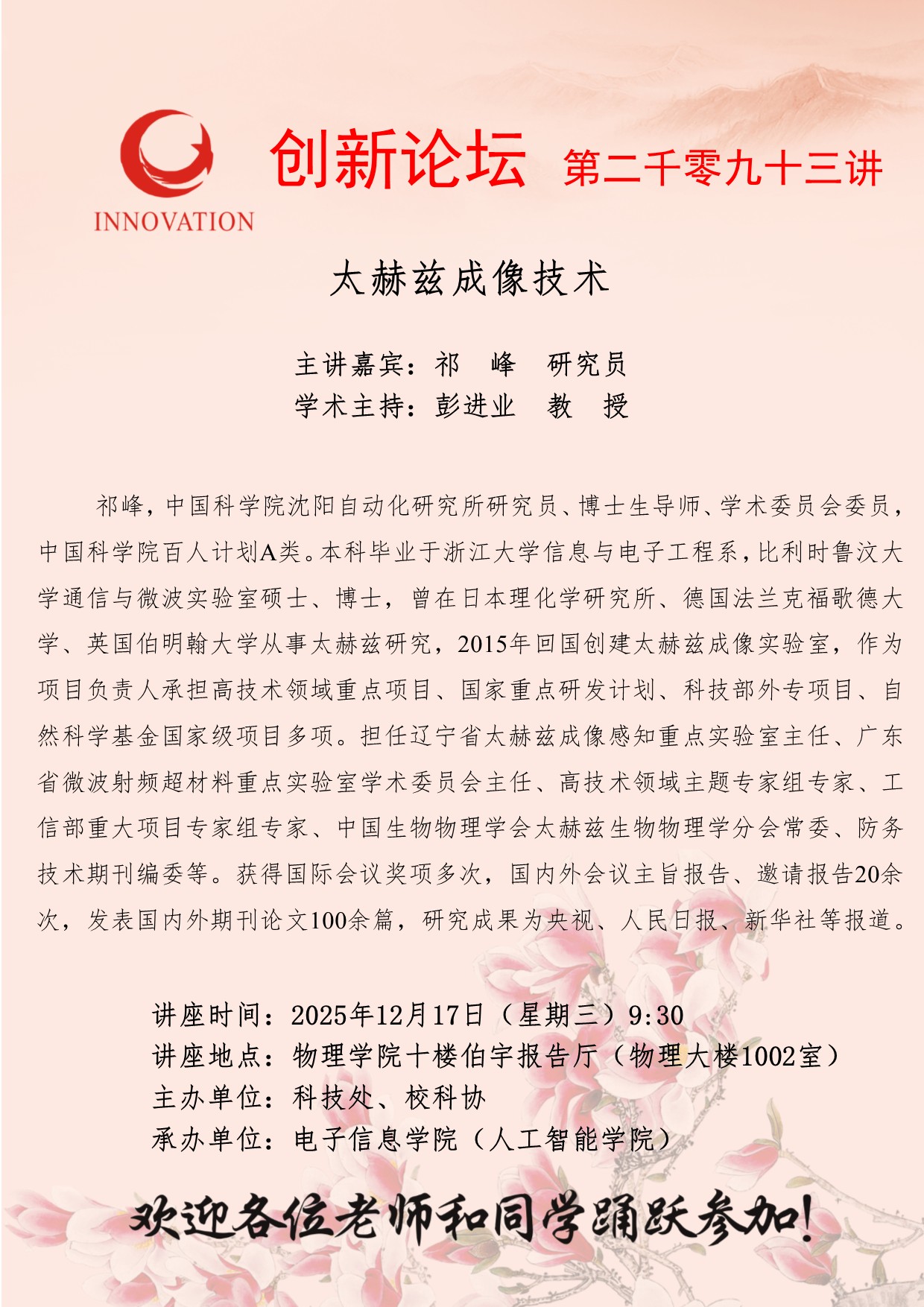 祁峰 研究员 米兰买球创新论坛第二千零九十三讲:太赫兹成像技术 讲座时间 2025年12月17日(星期三)9:30 讲座地点 物理学院十楼伯宇报告厅(物理大楼1002室) 讲座人介绍 祁峰 研究员 讲座内容