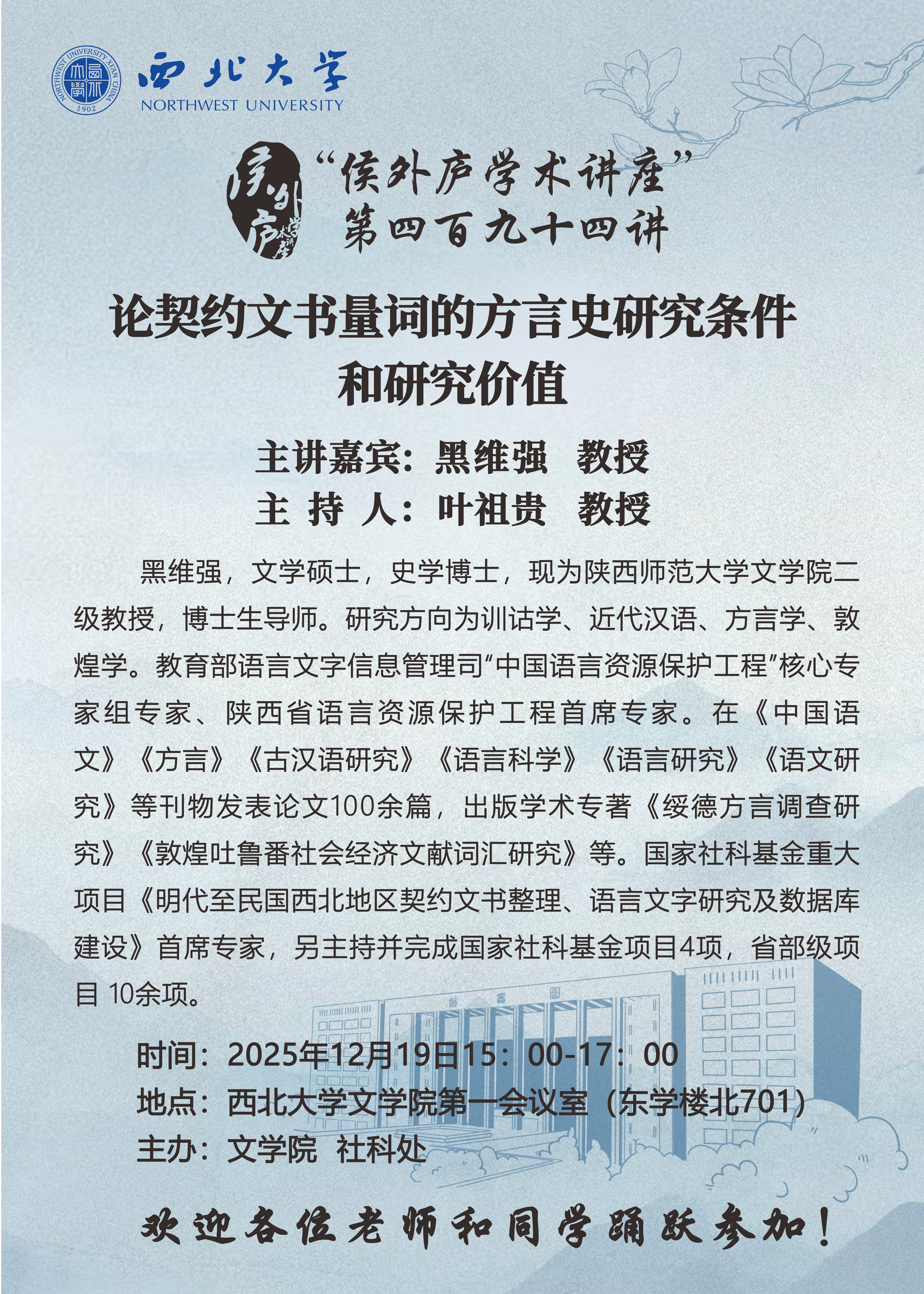 黑维强 教授 “侯外庐学术讲座” 第四百九十四讲:论契约文书量词的方言史研究条件和研究价值 讲座时间 2025年12月19日(星期五) 15:00-17:00 讲座地点 文学院第一会议室(东学楼北701) 讲座人介绍 黑维强 教授 讲座内容