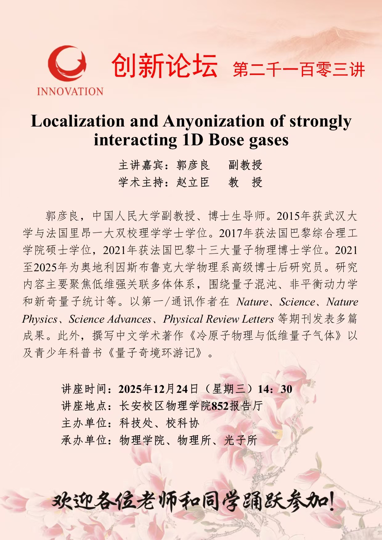 郭彦良 副教授 米兰买球创新论坛第二千一百零三讲:Localization and Anyonization of strongly interacting 1D Bose gases 讲座时间 2025年12月24日(星期三)14:30 讲座地点 长安校区物理学院852报告厅 讲座人介绍 郭彦良 副教授 讲座内容
