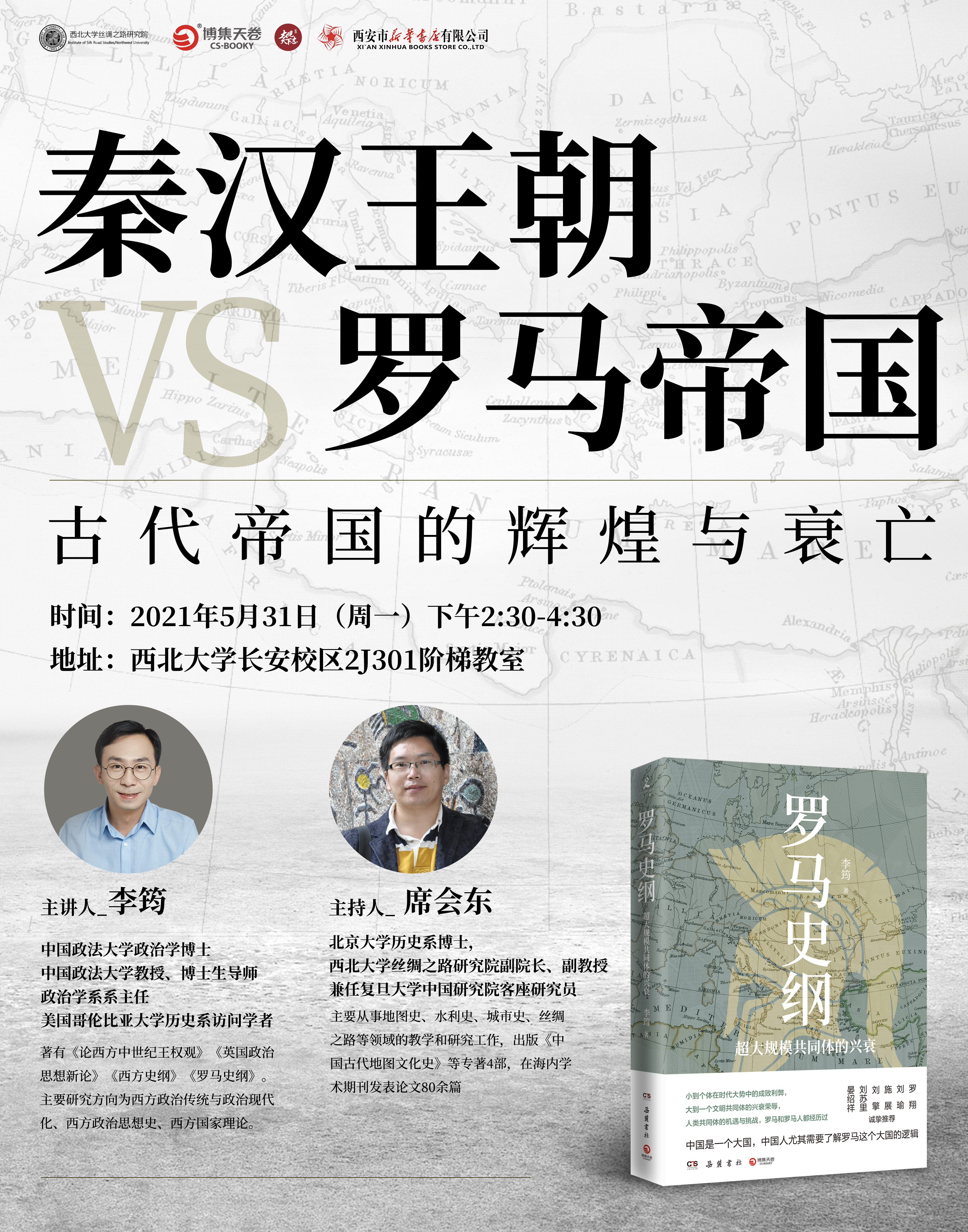 讲座预告:秦汉王朝VS罗马帝国:古代帝国的辉煌与衰亡 作者: 编辑:叶苗 时间:2021-05-30 时间:2021年5月31号(周一)下午2:30-4:30 地点:米兰买球长安校区2J301 主讲人:李筠 中国政法大学教授 主持人:席会东 米兰买球丝绸之路研究院副教授